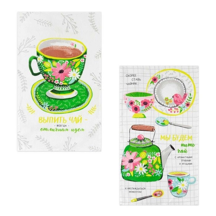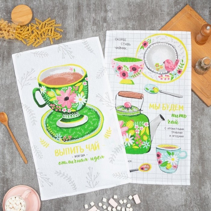 Набор кухонных полотенец Доляна «Чаепитие», 35х60см-2 шт, 100% хл, вафля 160 г/м2
