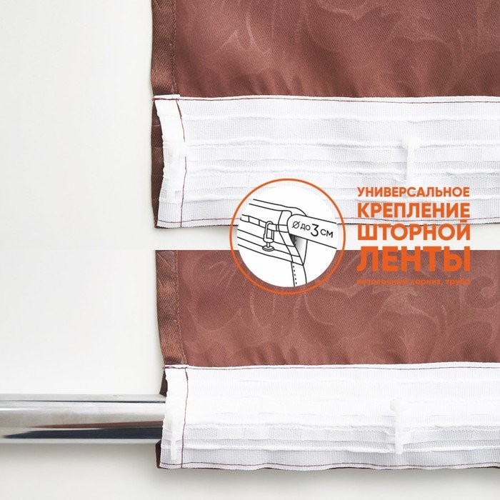 К портьерам пришита универсальная шторная лента. Возможно крепление на крючки и трубу диаметром до 3 см. С помощью специальных шнуров в ленте можно создать аккуратные, ровные складки.