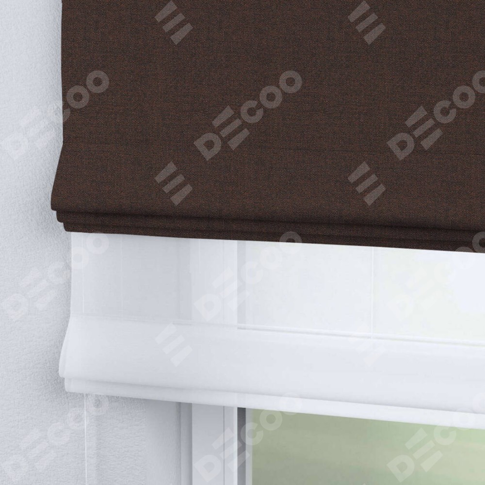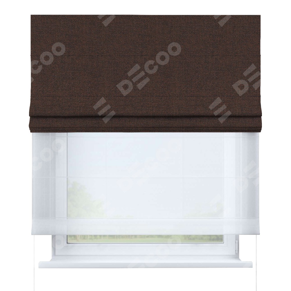 Римская штора день-ночь производителя «Cortin», используется для проёма, пошита из двух полотен, с лицевой стороны лён коричневый артикул 53443, вторая ткань тюль (по стандарту комплектуется тюль белого цвета артикул V-01). Имеет универсальный механизм и подходит для монтажа: на потолок, на стену и в нишу.