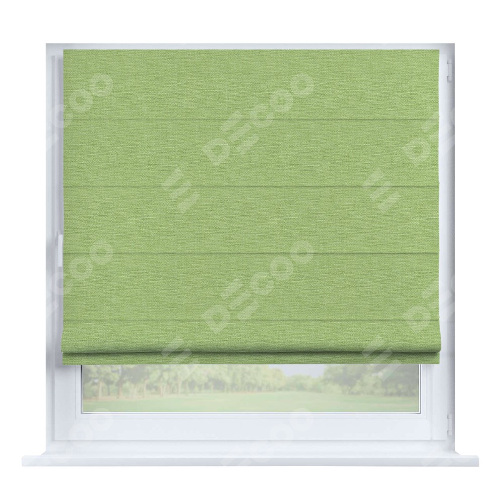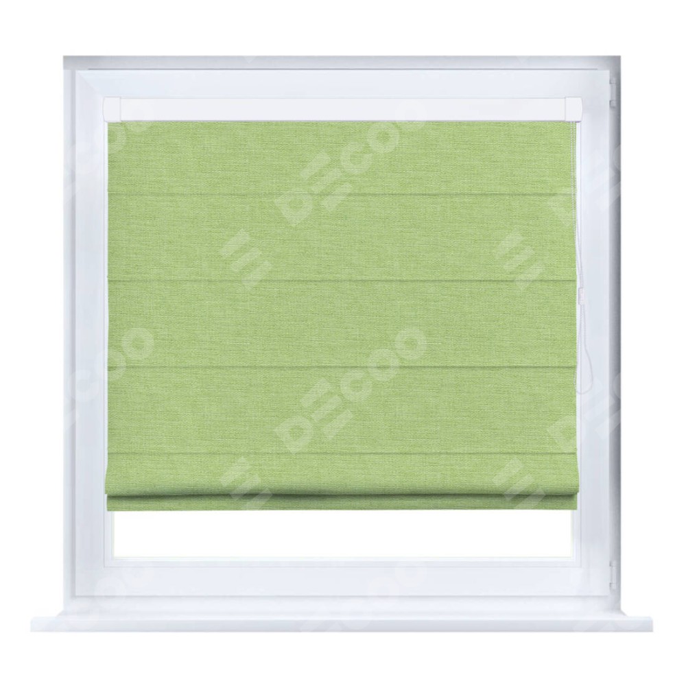 Римская штора производителя «Cortin», устанавливается на створку окна, пошита из ткани лён зелёный, артикул 85906. Штора шьётся по индивидуальным размерам, для данного типа римской шторы возможная ширина от 35 до 150 см., высота до 250 см.
