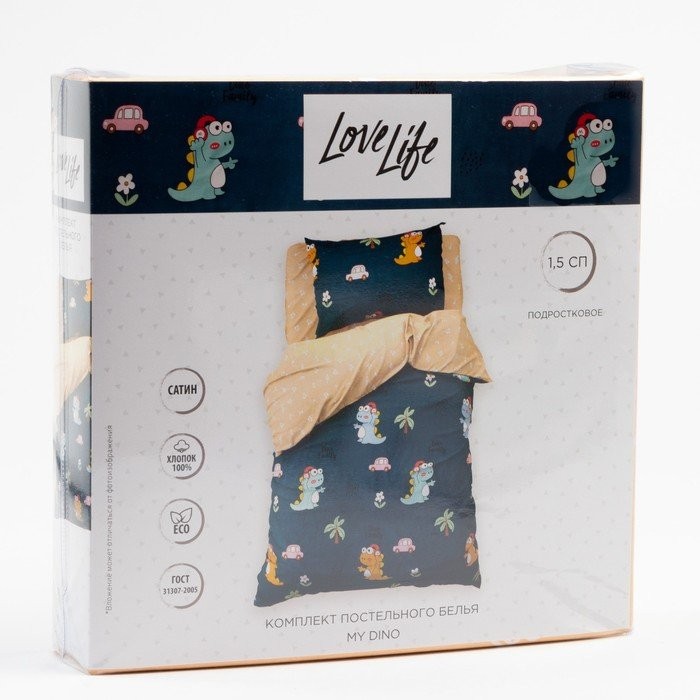 Постельное бельё 1.5 сп «LoveLife» My dino, 143×215 см,150×214 см,70×70 см-1 шт. сатин
