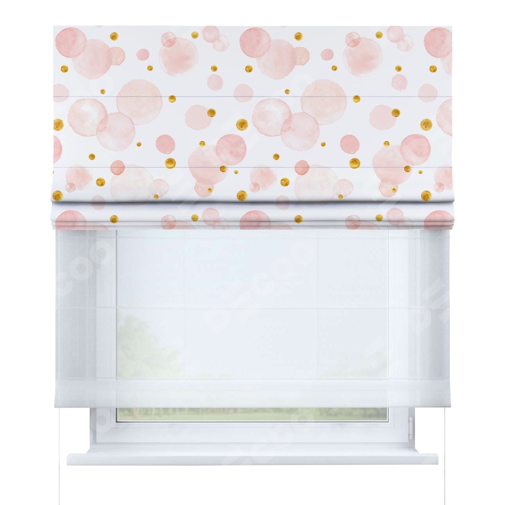 Римская штора день-ночь производителя «Cortin», используется для проёма, пошита из двух полотен, с лицевой блэкаут с нанесением сублимационной печати «Круги и точки», вторая ткань тюль (по стандарту комплектуется тюль белого цвета артикул V-01). Имеет универсальный механизм и подходит для монтажа: на потолок, на стену и в нишу.