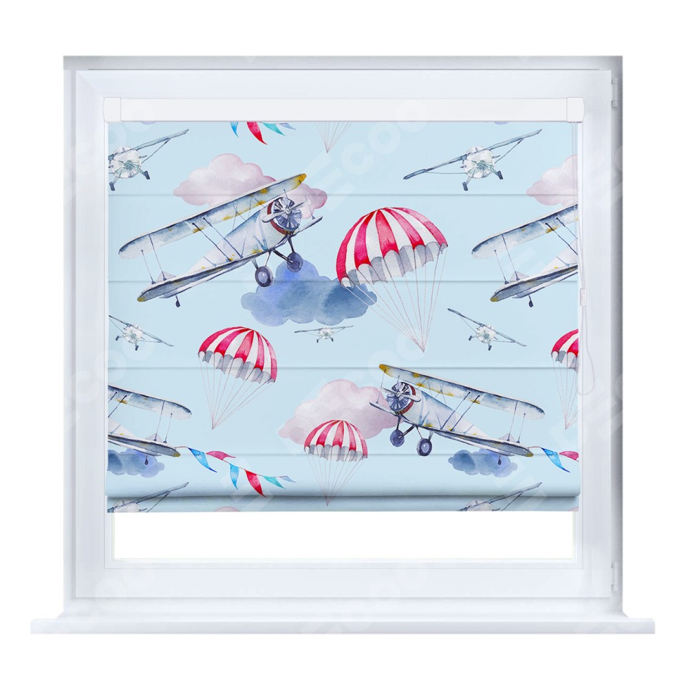 Римская штора кассетного типа, производителя «Cortin», устанавливается только на пластиковые окна и прилегает к стеклопакету, пошита из ткани блэкаут с нанесением сублимационной печати «Самолёт».