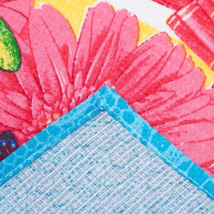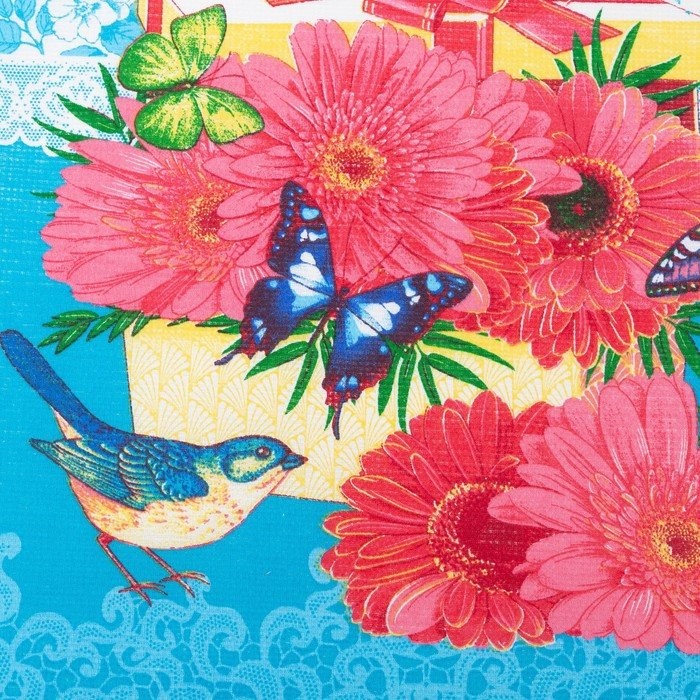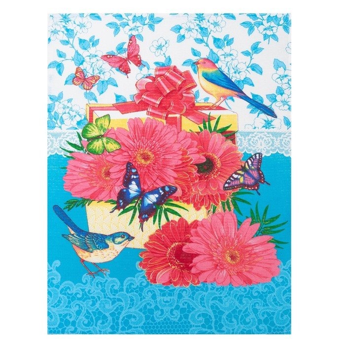 Полотенце в коробке 45×60 см, Герберы, бирюза, вафля, 160 гр/м2, хлопок 100%