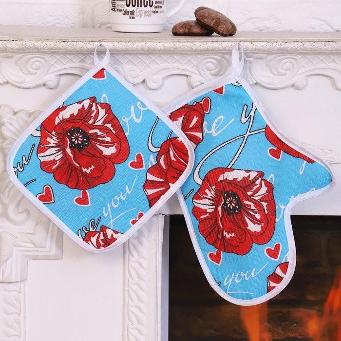 Набор кухонный Маки 243 (варежка+прихватка), бирюзовый, хл, рогожка