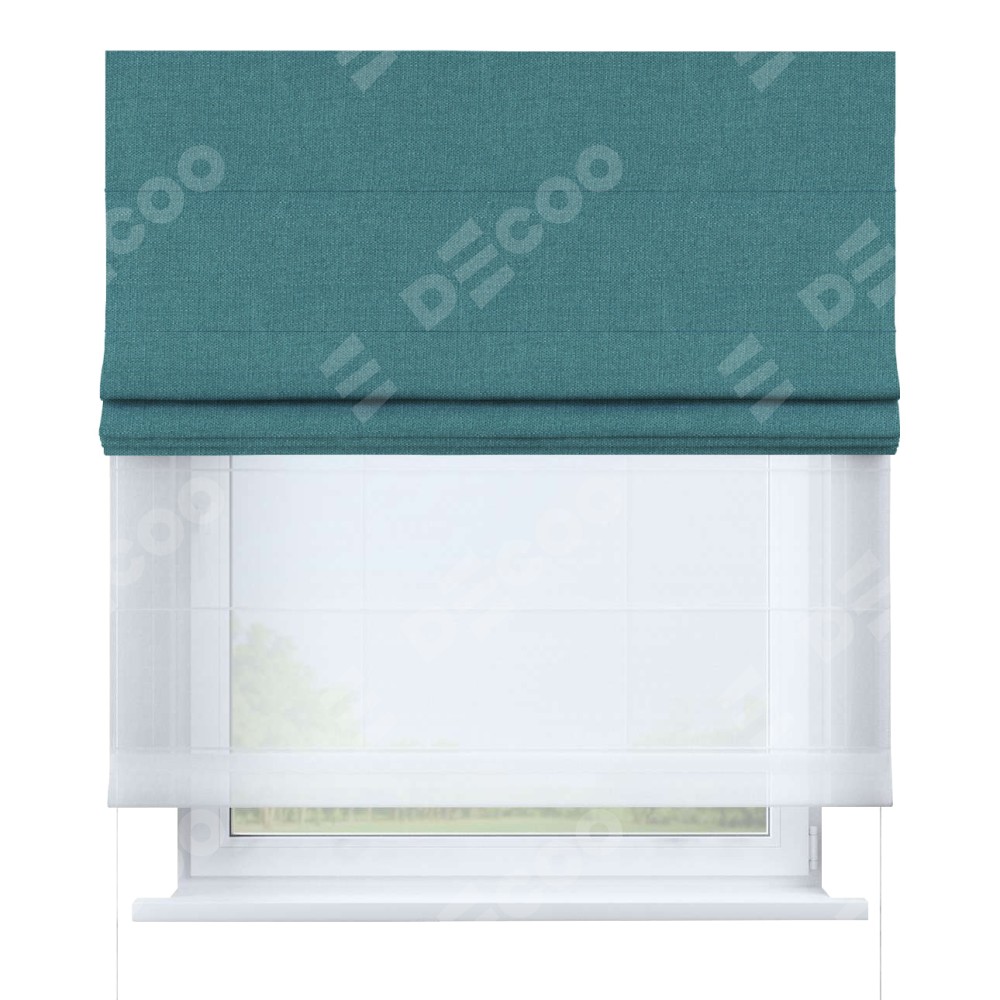 Римская штора день-ночь производителя «Cortin», используется для проёма, пошита из двух полотен, с лицевой стороны лён бирюзовый артикул 53436, вторая ткань тюль (по стандарту комплектуется тюль белого цвета артикул V-01). Имеет универсальный механизм и подходит для монтажа: на потолок, на стену и в нишу.
