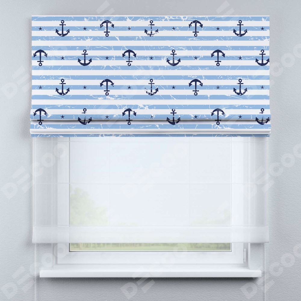 Римская штора день-ночь производителя «Cortin», используется для проёма, пошита из двух полотен, с лицевой блэкаут с нанесением сублимационной печати «Полоски и якори», вторая ткань тюль (по стандарту комплектуется тюль белого цвета артикул V-01). Имеет универсальный механизм и подходит для монтажа: на потолок, на стену и в нишу.