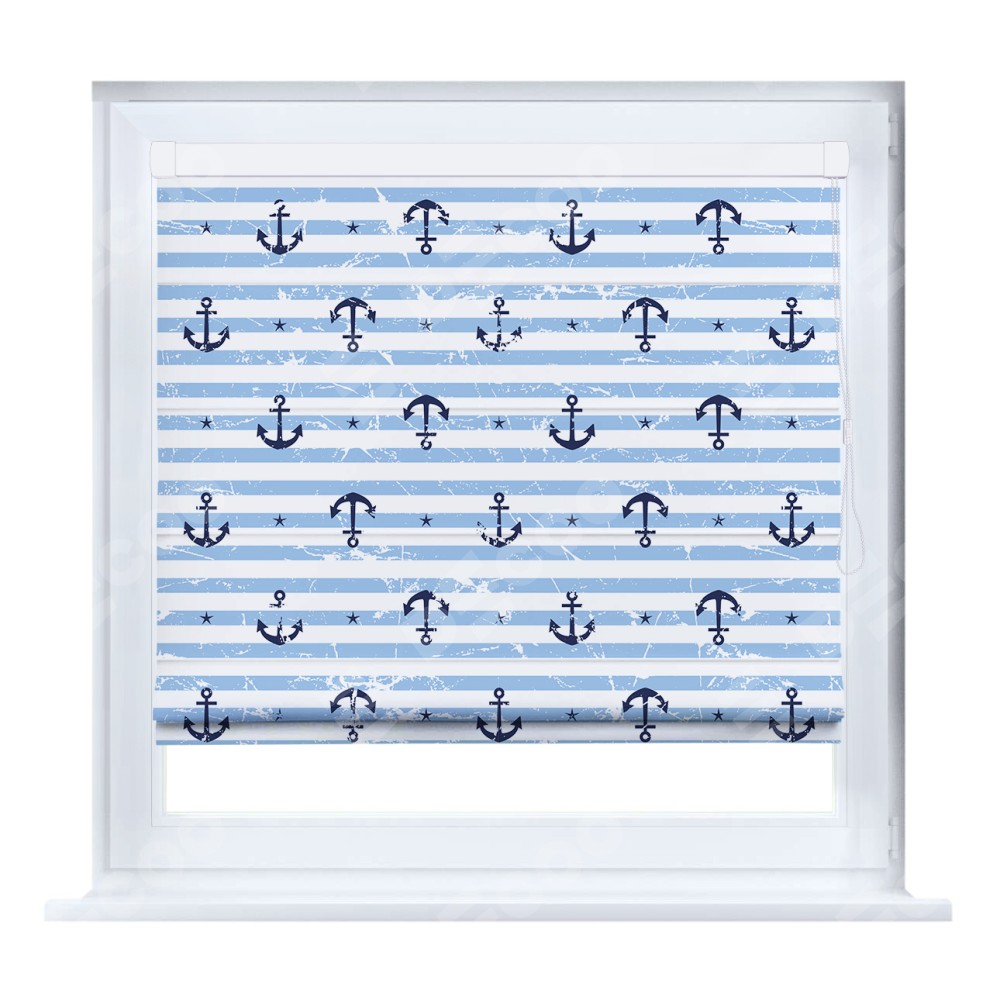 Римская штора кассетного типа, производителя «Cortin», устанавливается только на пластиковые окна и прилегает к стеклопакету, пошита из ткани блэкаут с нанесением сублимационной печати «Полоски и якори».