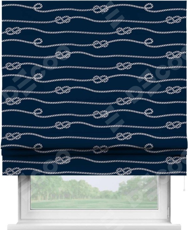Римская штора производителя «Cortin», используется для проёма, пошита из ткани блэкаут с нанесением сублимационной печати «Морской узел». Имеет универсальный механизм и подходит для монтажа: на потолок, на стену и в нишу.