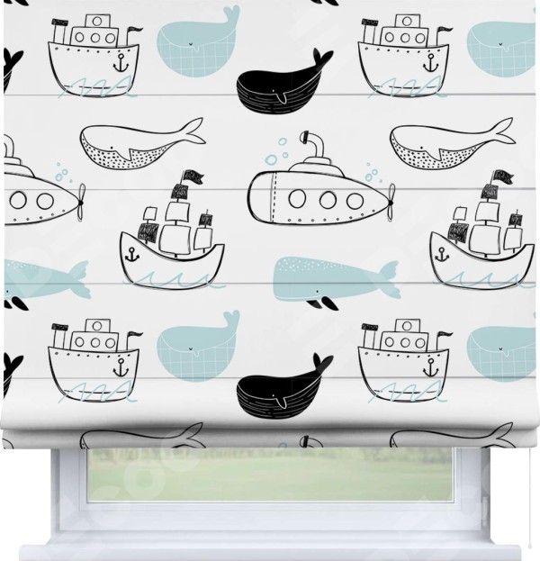 Римская штора производителя «Cortin», используется для проёма, пошита из ткани блэкаут с нанесением сублимационной печати «Морская прогулка». Имеет универсальный механизм и подходит для монтажа: на потолок, на стену и в нишу.