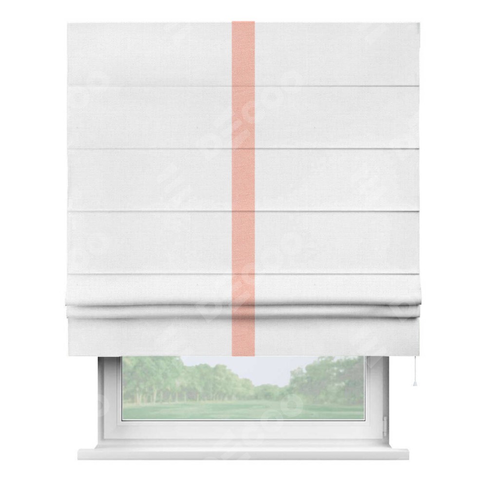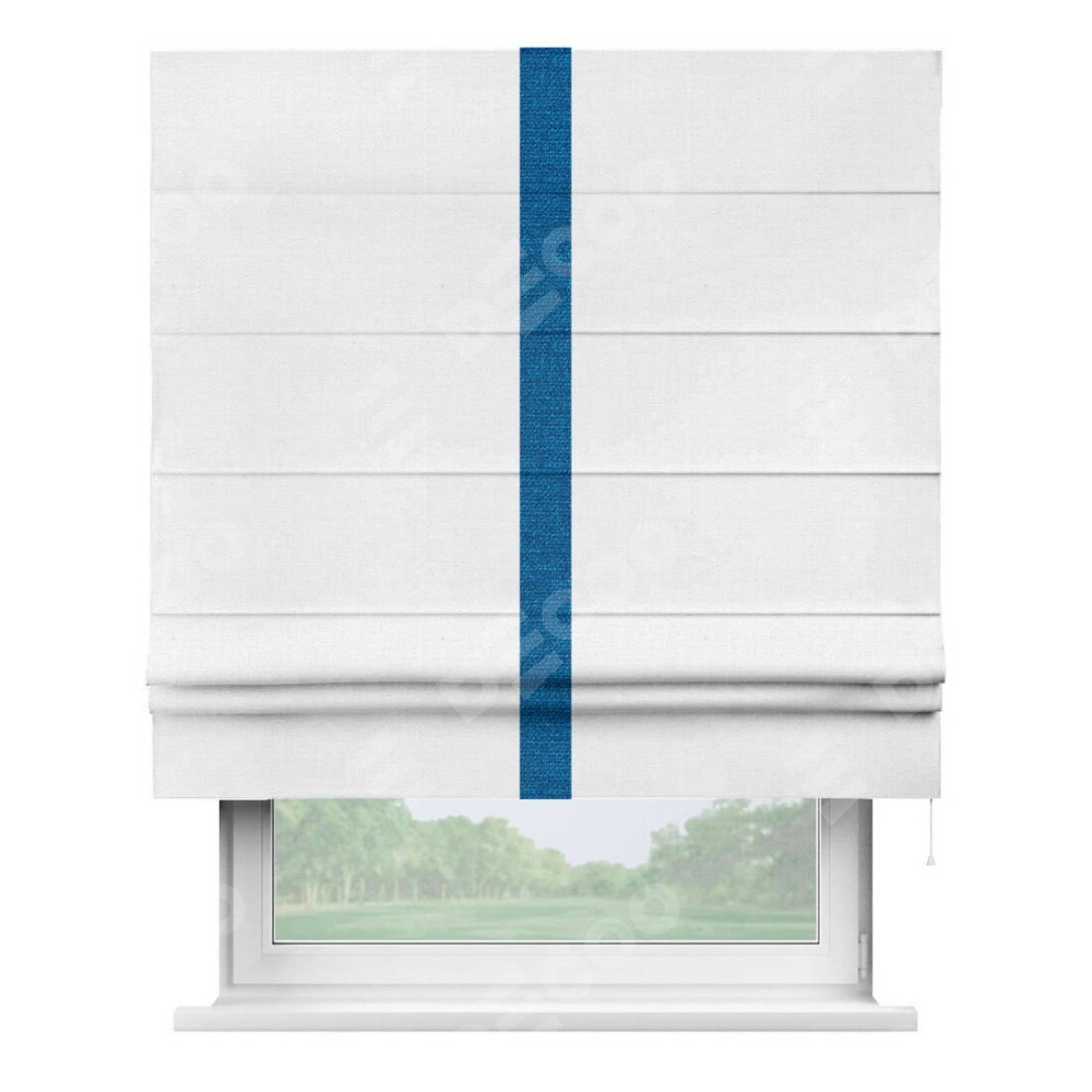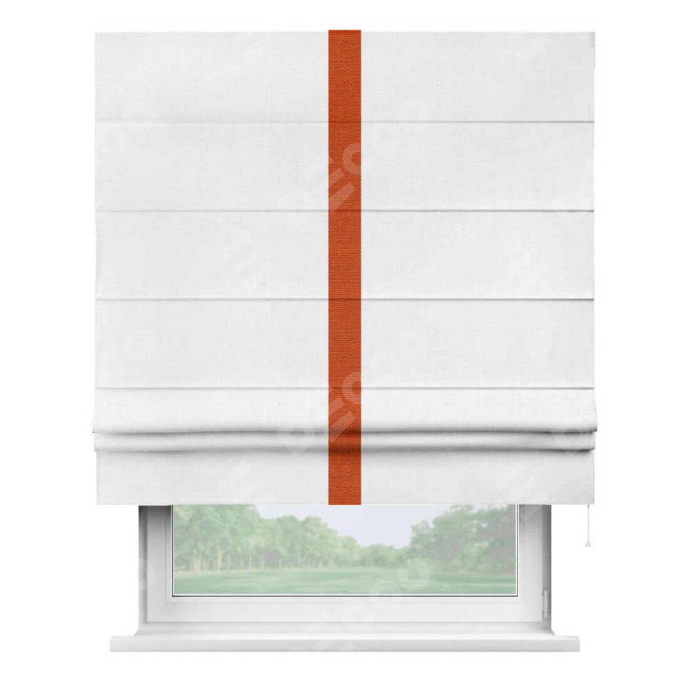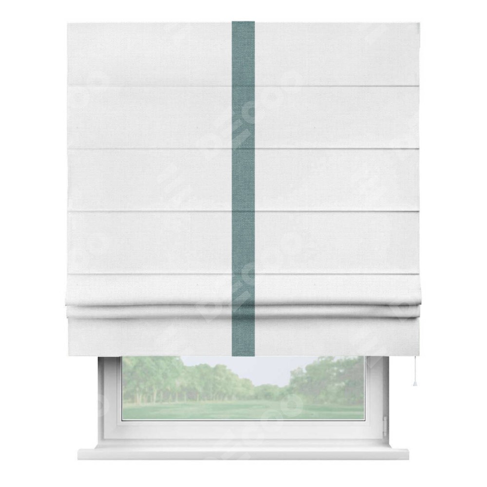 Римская штора производителя «Cortin», используется для проёма, пошита из ткани лён белый, артикул 53430. Отделка шторы кантом «Хайвэй», ткань для канта используется из льна разной расцветки на выбор. Имеет универсальный механизм и подходит для монтажа: на потолок, на стену и в нишу.