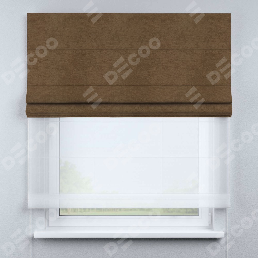 Римская штора день-ночь производителя «Cortin», используется для проёма, пошита из двух полотен, с лицевой стороны софт однотонный бронзовый артикул 33099, вторая ткань тюль (по стандарту комплектуется тюль белого цвета артикул V-01). Имеет универсальный механизм и подходит для монтажа: на потолок, на стену и в нишу.