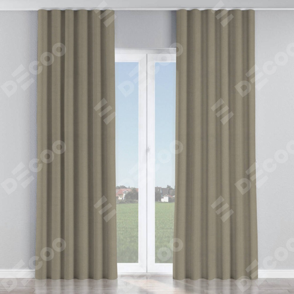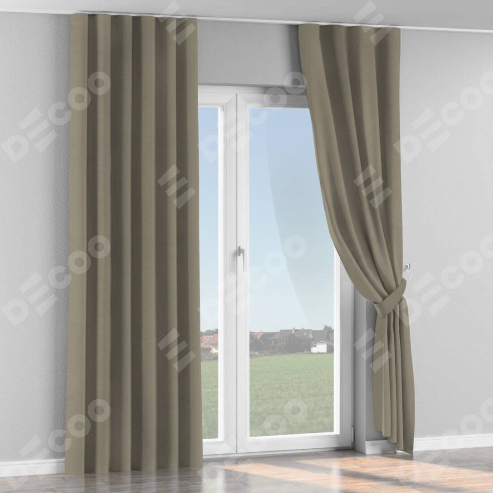 Комплект прямых штор, от производителя «Cortin», пошиты из ткани блэкаут однотонный бежево-серый, артикул ткани 00004. С изнаночной стороны в верхней части штор пристрачивается шторная лента с декоративными складками «Волна». Для создания элегантных складок прямые шторы шьются по стандарту с коэффициентом 1:2 (на 100 см. ширины проёма 200 см. ширины ткани).