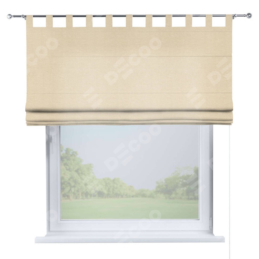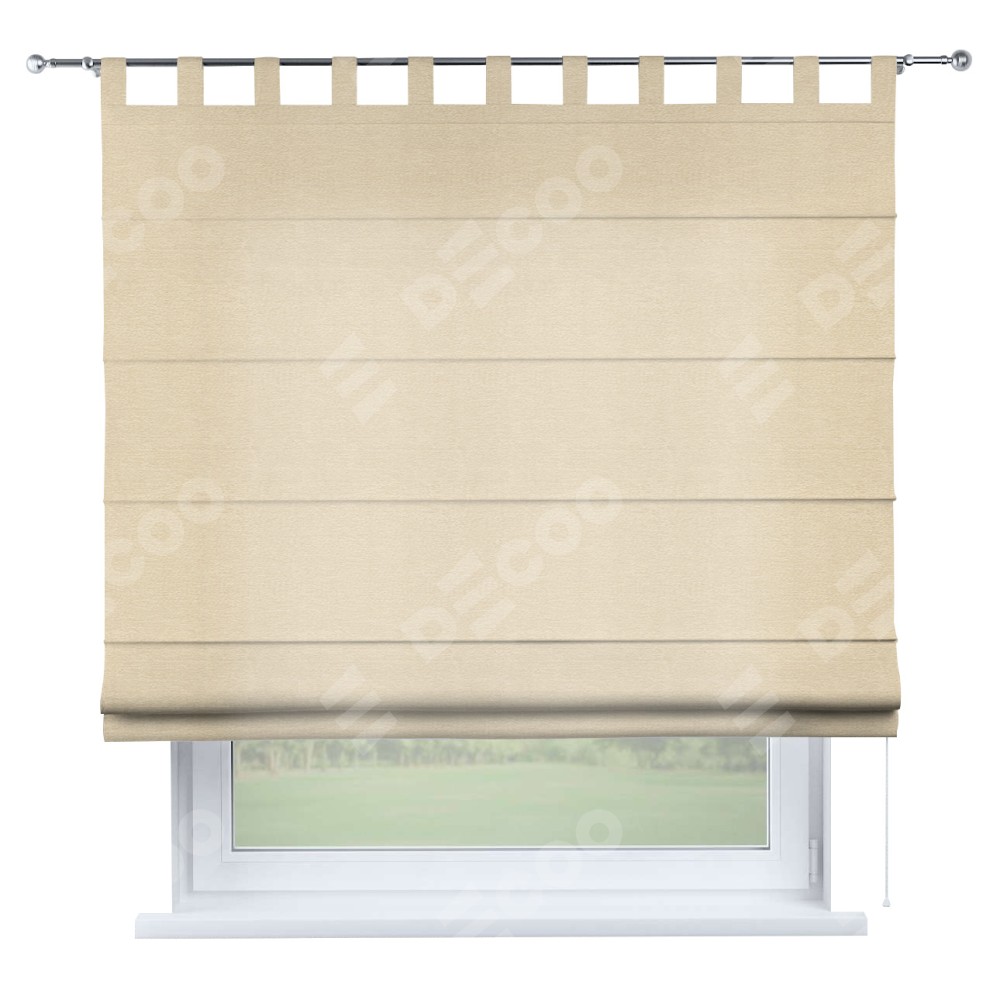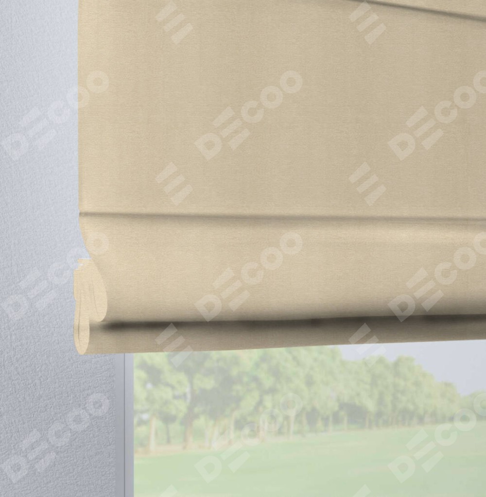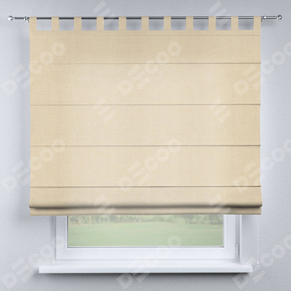 Римская штора производителя «Cortin», используется для проёма, пошита из ткани софт однотонный бежевый лайт, артикул ткани 33100. Данная модель пошита на петлях, комплектуется на выбор круглым карнизом и подходит для монтажа на стену. Римская штора на петлях имеет простую систему регулировки высоты, отличительным преимуществом данной модели является простой способ монтажа. Достаточно повесить ее на трубу и штора готова!