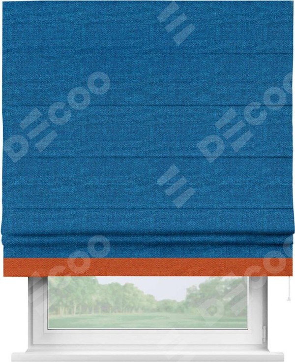 Римская штора производителя «Cortin», используется для проёма, пошита из ткани лён синий, артикул 63742. Отделка шторы кантом «Джестер», ткань для канта используется из льна разной расцветки на выбор. Имеет универсальный механизм и подходит для монтажа: на потолок, на стену и в нишу.