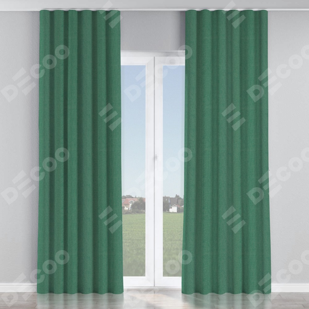 Комплект прямых штор, от производителя «Cortin», пошиты из ткани твид блэкаут зелёный, артикул ткани 21589. С изнаночной стороны в верхней части штор пристрачивается шторная лента с декоративными складками «Волна». Для создания элегантных складок прямые шторы шьются по стандарту с коэффициентом 1:2 (на 100 см. ширины проёма 200 см. ширины ткани).