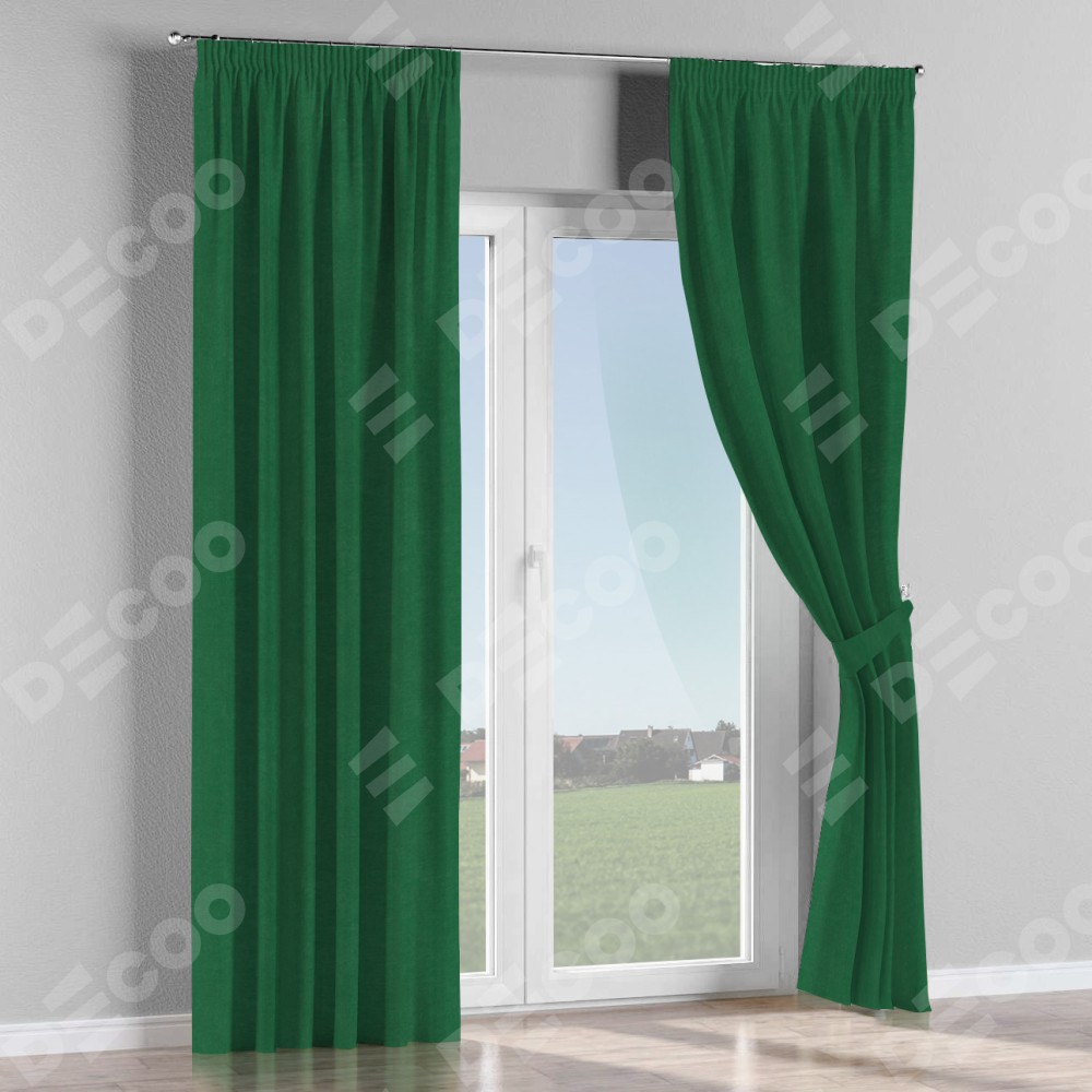 Комплект прямых штор, от производителя «Cortin», пошиты из ткани вельвет зелёный, артикул ткани 85546. С изнаночной стороны в верхней части штор пристрачивается шторная лента с декоративными складками «Карандаш». Для создания элегантных складок прямые шторы шьются по стандарту с коэффициентом 1:2 (на 100 см. ширины проёма 200 см. ширины ткани).