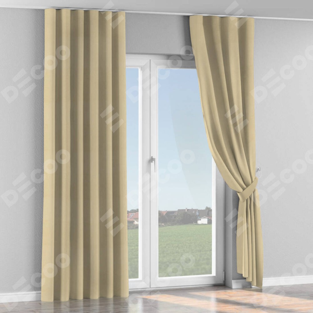 Комплект прямых штор, от производителя «Cortin», пошиты из ткани блэкаут однотонный милано латте, артикул ткани 05. С изнаночной стороны в верхней части штор пристрачивается шторная лента с декоративными складками «Волна». Для создания элегантных складок прямые шторы шьются по стандарту с коэффициентом 1:2 (на 100 см. ширины проёма 200 см. ширины ткани).
