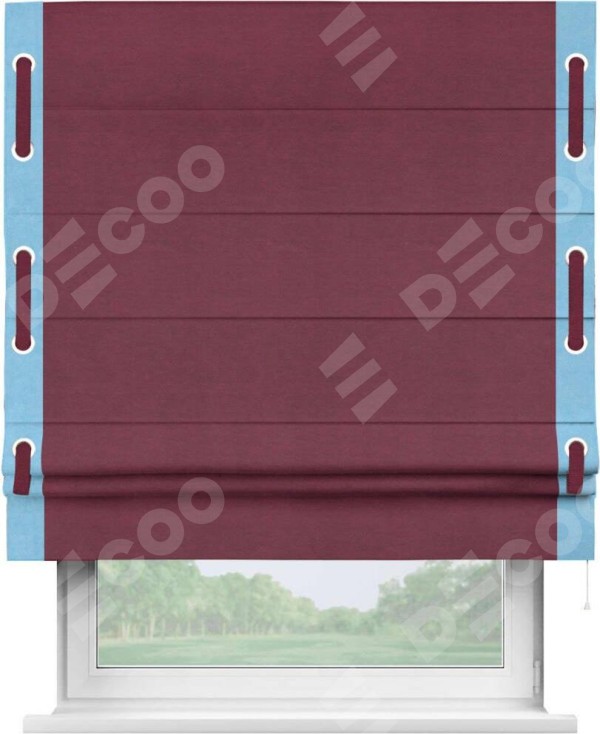 Римская штора производителя «Cortin», используется для проёма, пошита из ткани вельвет бордовый, артикул ткани 85553. Отделка шторы кантом «Стрим Дуо» на кантах расположены люверсы с пояском, ткань для канта используется из вельвета разной расцветки на выбор. Ткань для пояска обычно используется из основной ткани шторы, а так же можно сделать из любой расцветки по желанию. Имеет универсальный механизм и подходит для монтажа: на потолок, на стену и в нишу.