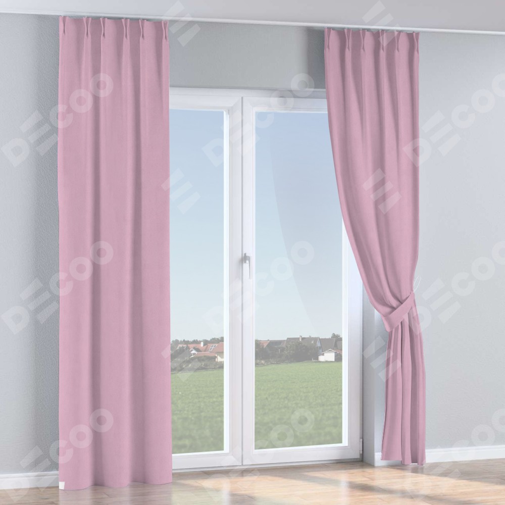 Комплект прямых штор, от производителя «Cortin», пошиты из ткани pipa блэкаут розовый, артикул ткани 12091. С изнаночной стороны в верхней части штор пристрачивается шторная лента с декоративными складками «Кустик». Для создания элегантных складок прямые шторы шьются по стандарту с коэффициентом 1:2 (на 100 см. ширины проёма 200 см. ширины ткани).