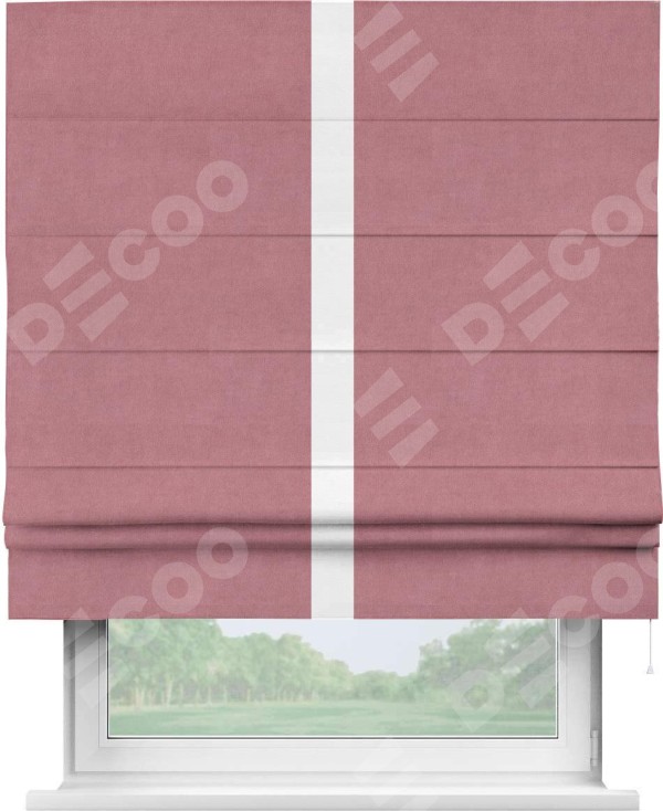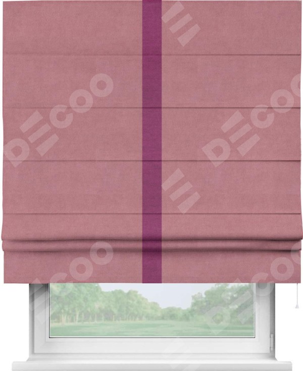 Римская штора производителя «Cortin», используется для проёма, пошита из ткани вельвет брусника, артикул ткани 85550. Отделка шторы кантом «Хайвей», ткань для канта используется из вельвета разной расцветки на выбор. Имеет универсальный механизм и подходит для монтажа: на потолок, на стену и в нишу.