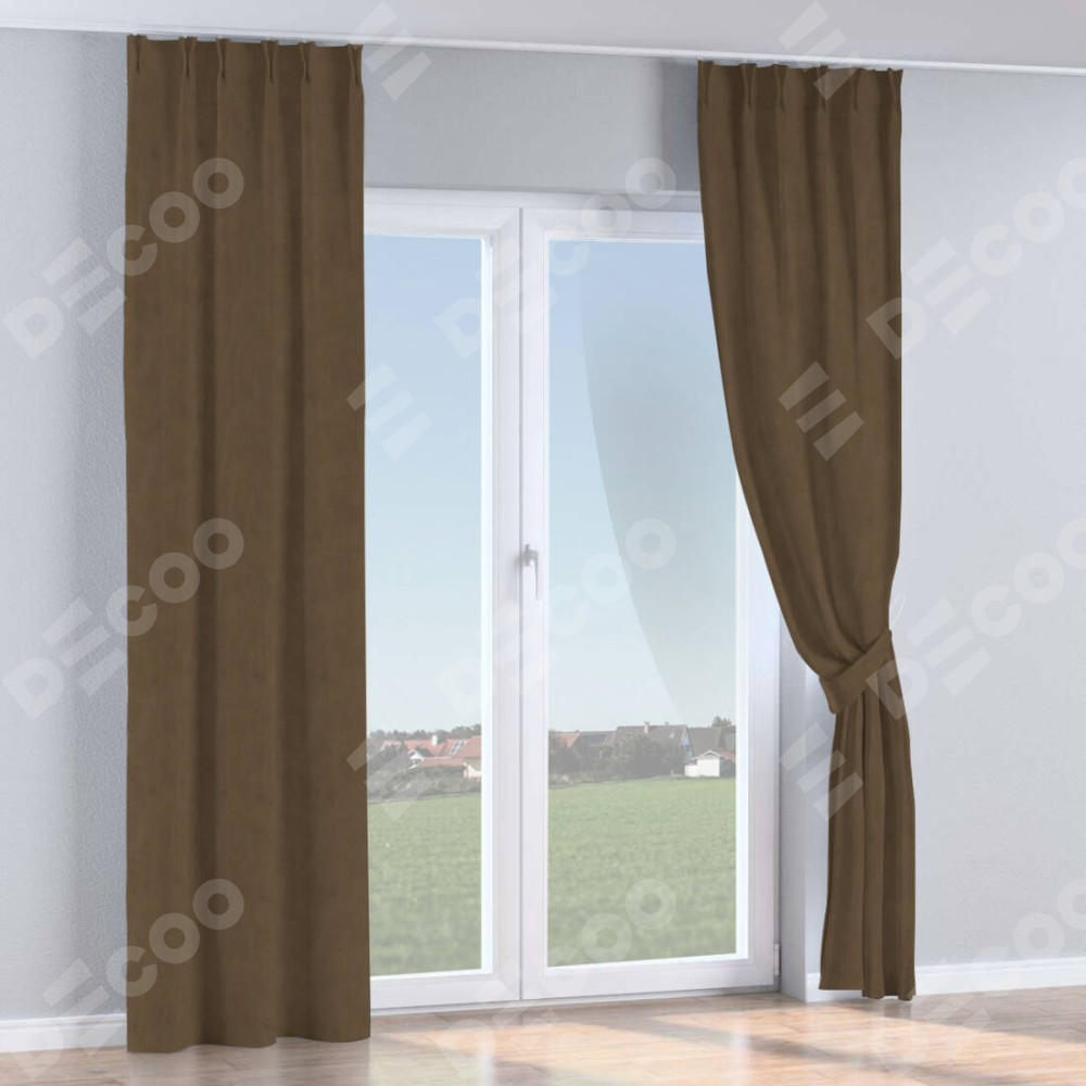 Комплект прямых штор, от производителя «Cortin», пошиты из ткани бархат тёмно-коричневый, артикул ткани 5017. С изнаночной стороны в верхней части штор пристрачивается шторная лента с декоративными складками «Кустик». Для создания элегантных складок прямые шторы шьются по стандарту с коэффициентом 1:2 (на 100 см. ширины проёма 200 см. ширины ткани).