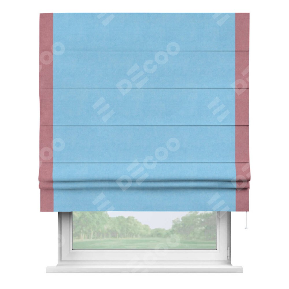 Римская штора производителя «Cortin», используется для проёма, пошита из ткани вельвет голубой, артикул ткани 85544. Отделка шторы кантом «Стрим Дуо», ткань для канта используется из вельвета разной расцветки на выбор. Имеет универсальный механизм и подходит для монтажа: на потолок, на стену и в нишу.