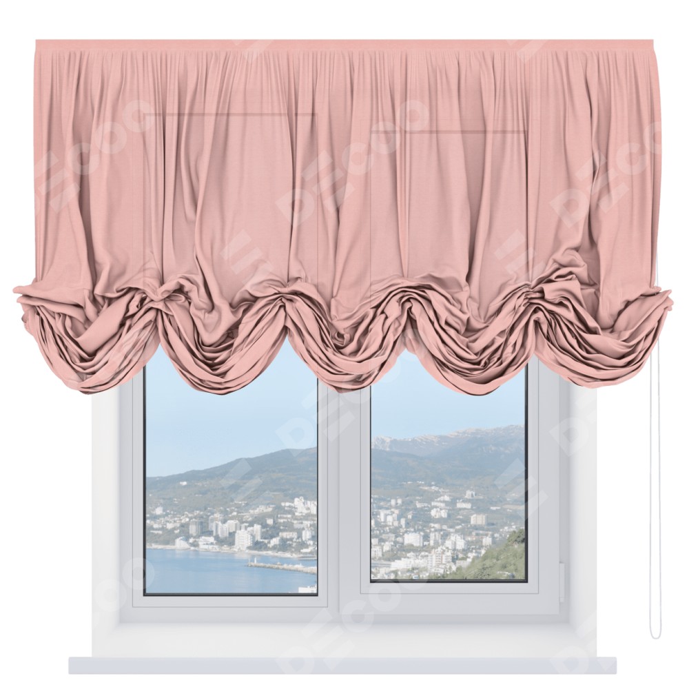 Австрийская штора производителя «Cortin», используется для проёма, пошита из ткани лён розовый, артикул ткани 00005. Имеет универсальный механизм и подходит для монтажа: на потолок и на стену.
