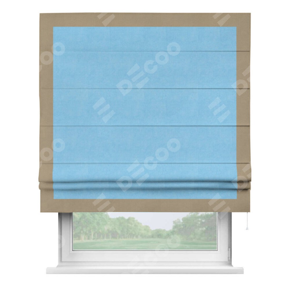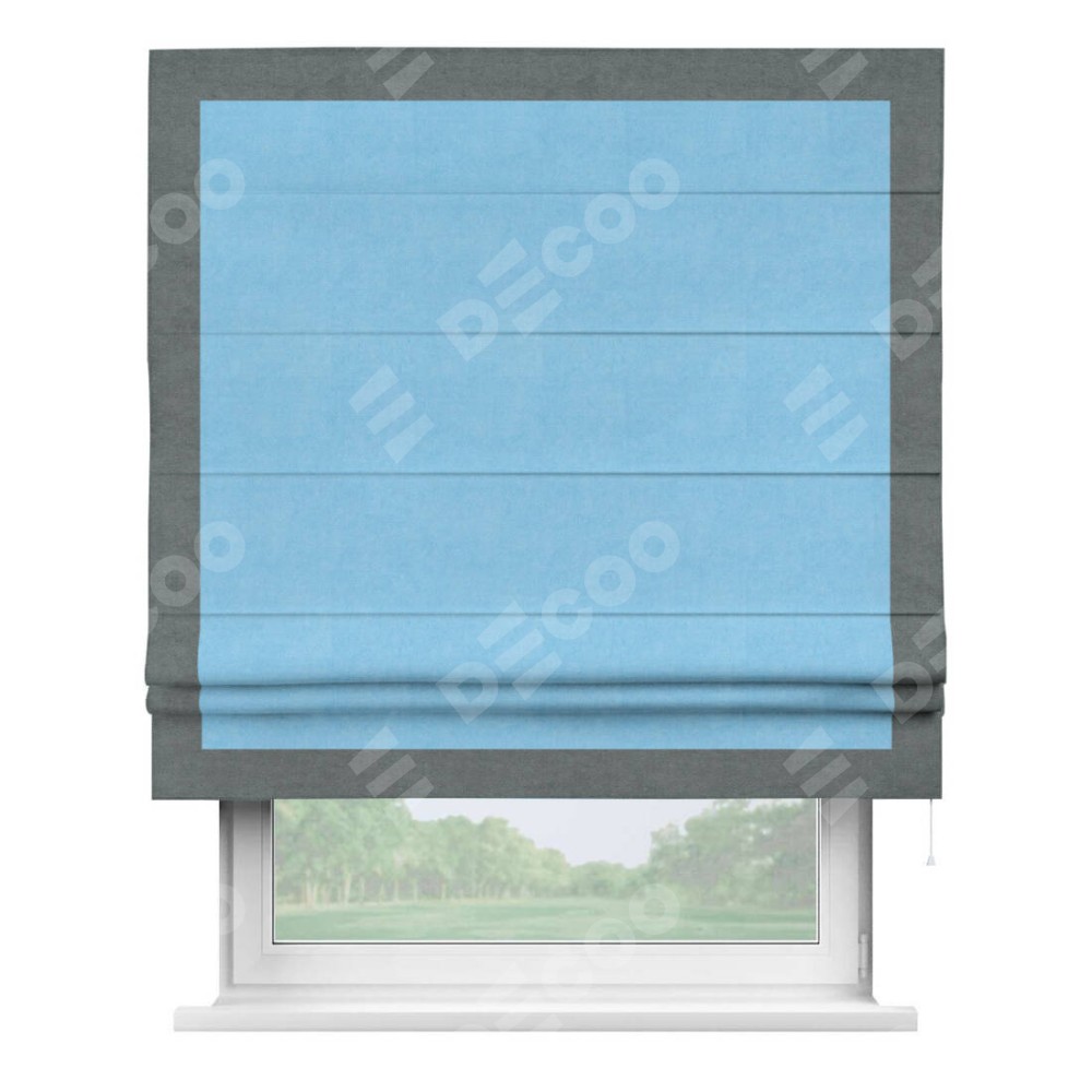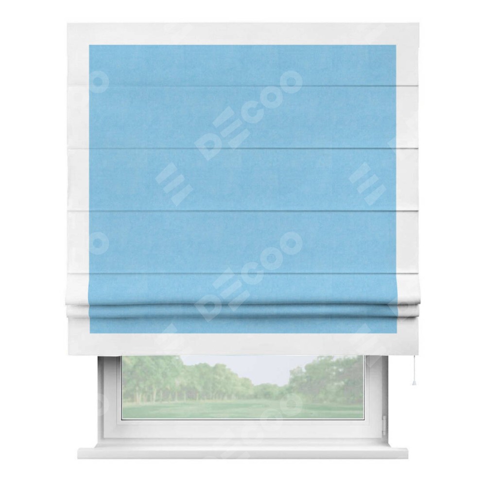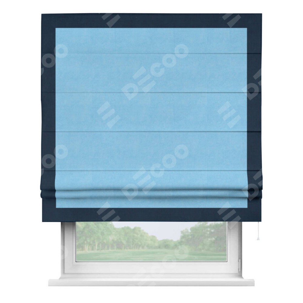 Римская штора производителя «Cortin», используется для проёма, пошита из ткани вельвет голубой, артикул ткани 85544. Отделка шторы кантом «Чесс», ткань для канта используется из вельвета разной расцветки на выбор. Имеет универсальный механизм и подходит для монтажа: на потолок, на стену и в нишу.