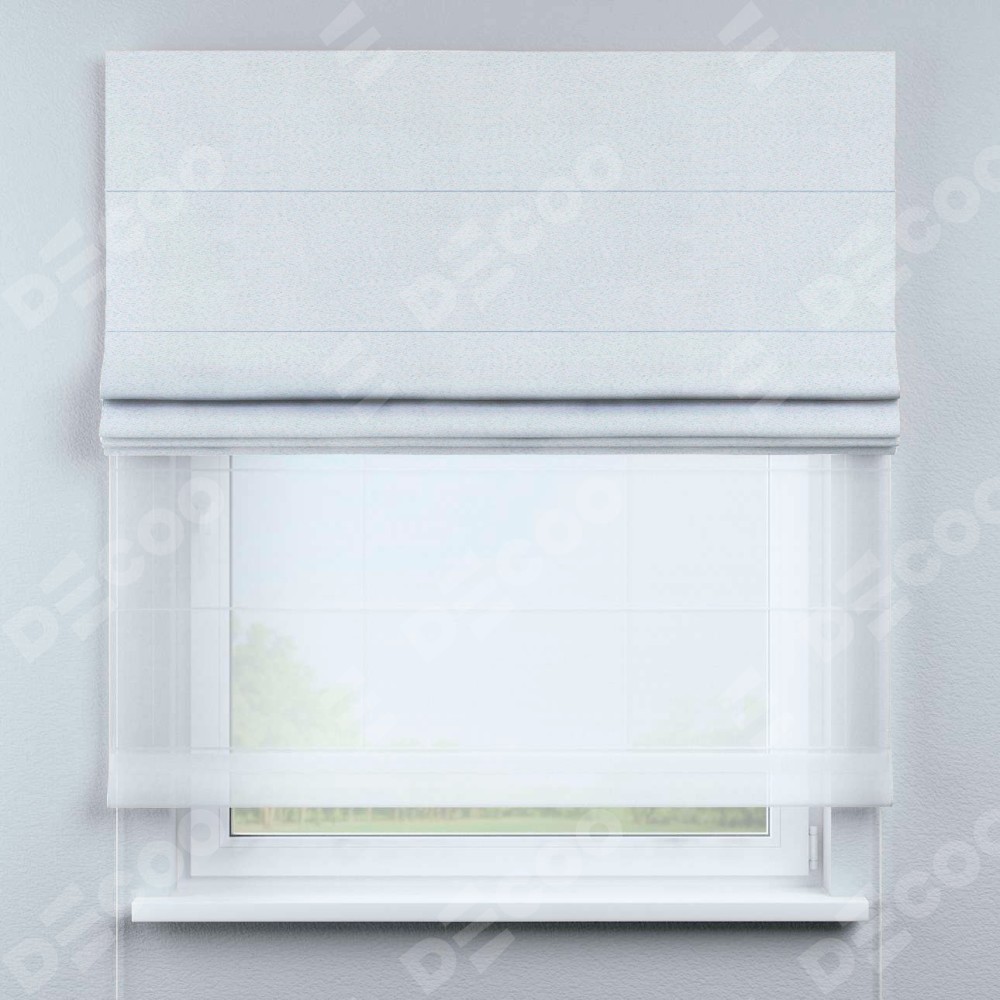 Римская штора день-ночь производителя «Cortin», используется для проёма, пошита из двух полотен, с лицевой стороны блэкаут однотонный дымчато-белый артикул 101, вторая ткань тюль (по стандарту комплектуется тюль белого цвета артикул V-01). Имеет универсальный механизм и подходит для монтажа: на потолок, на стену и в нишу.