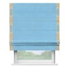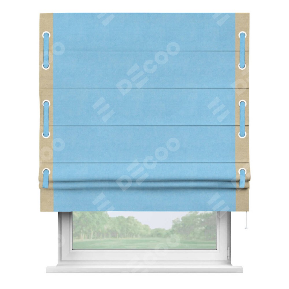 Римская штора производителя «Cortin», используется для проёма, пошита из ткани вельвет голубой, артикул ткани 85544. Отделка шторы кантом «Стрим Дуо» на кантах расположены люверсы с пояском, ткань для канта используется из вельвета разной расцветки на выбор. Ткань для пояска обычно используется из основной ткани шторы, а так же можно сделать из любой расцветки по желанию. Имеет универсальный механизм и подходит для монтажа: на потолок, на стену и в нишу.