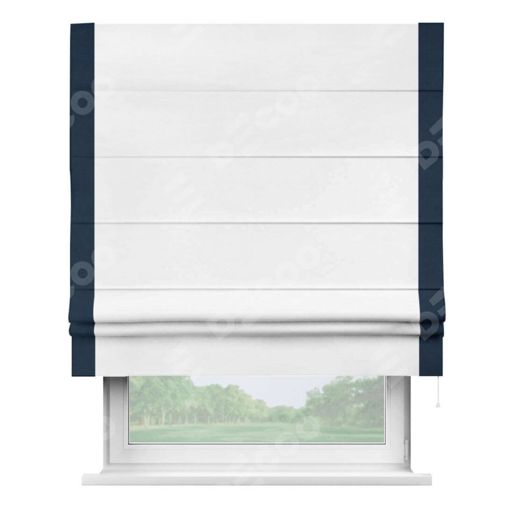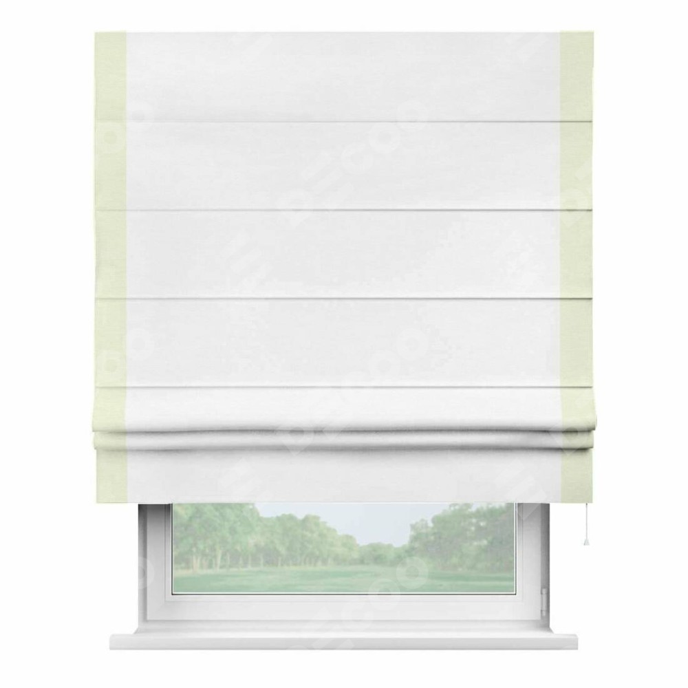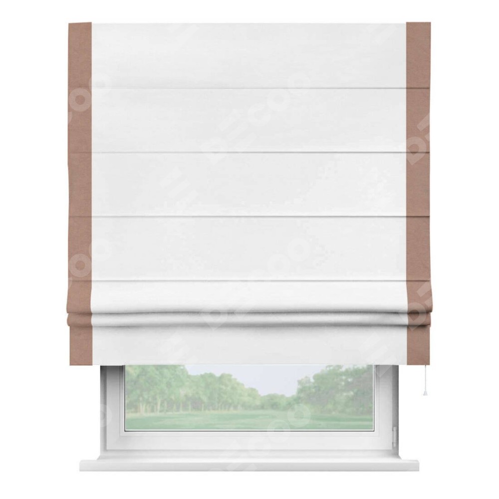 Римская штора производителя «Cortin», используется для проёма, пошита из ткани вельвет дымчато-белый, артикул ткани 85535. Отделка шторы кантом «Стрим Дуо», ткань для канта используется из вельвета разной расцветки на выбор. Имеет универсальный механизм и подходит для монтажа: на потолок, на стену и в нишу.