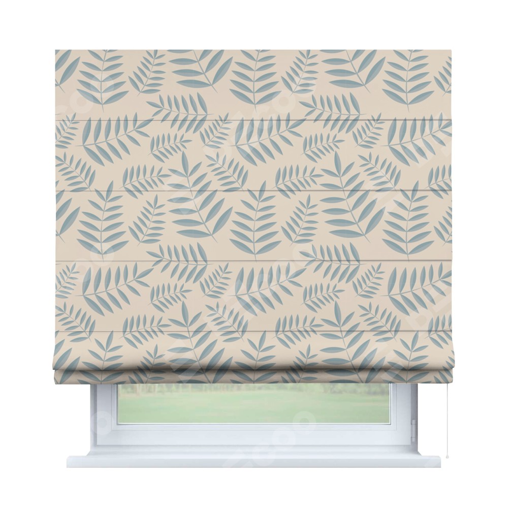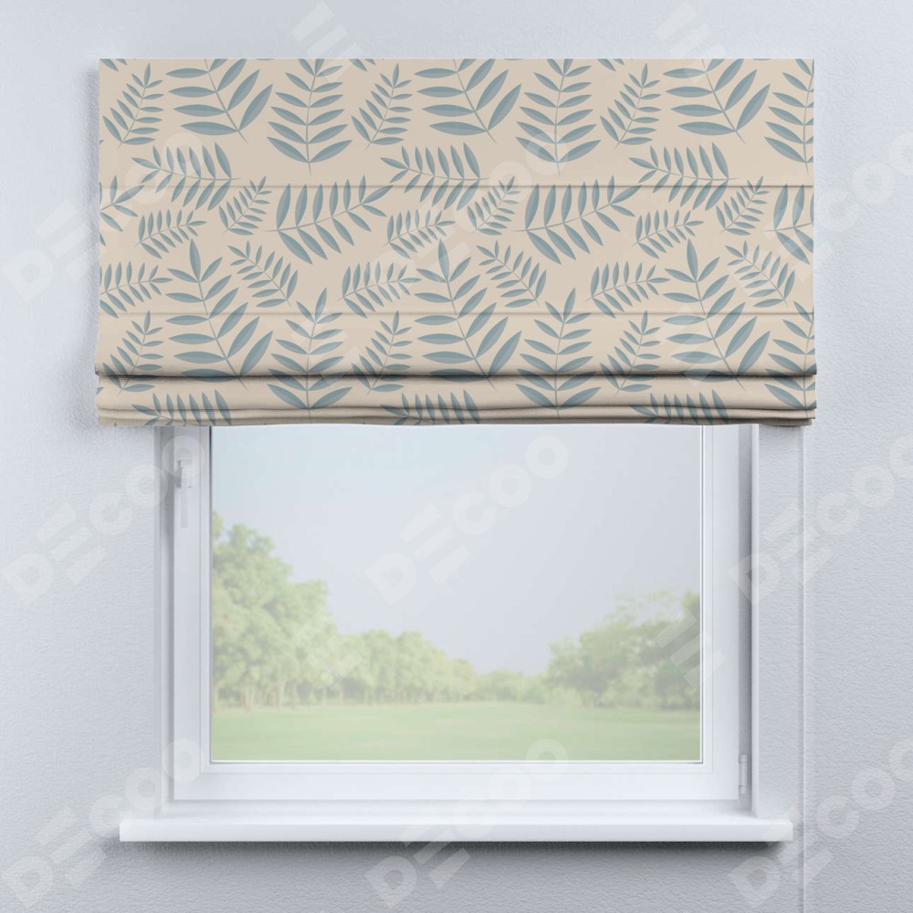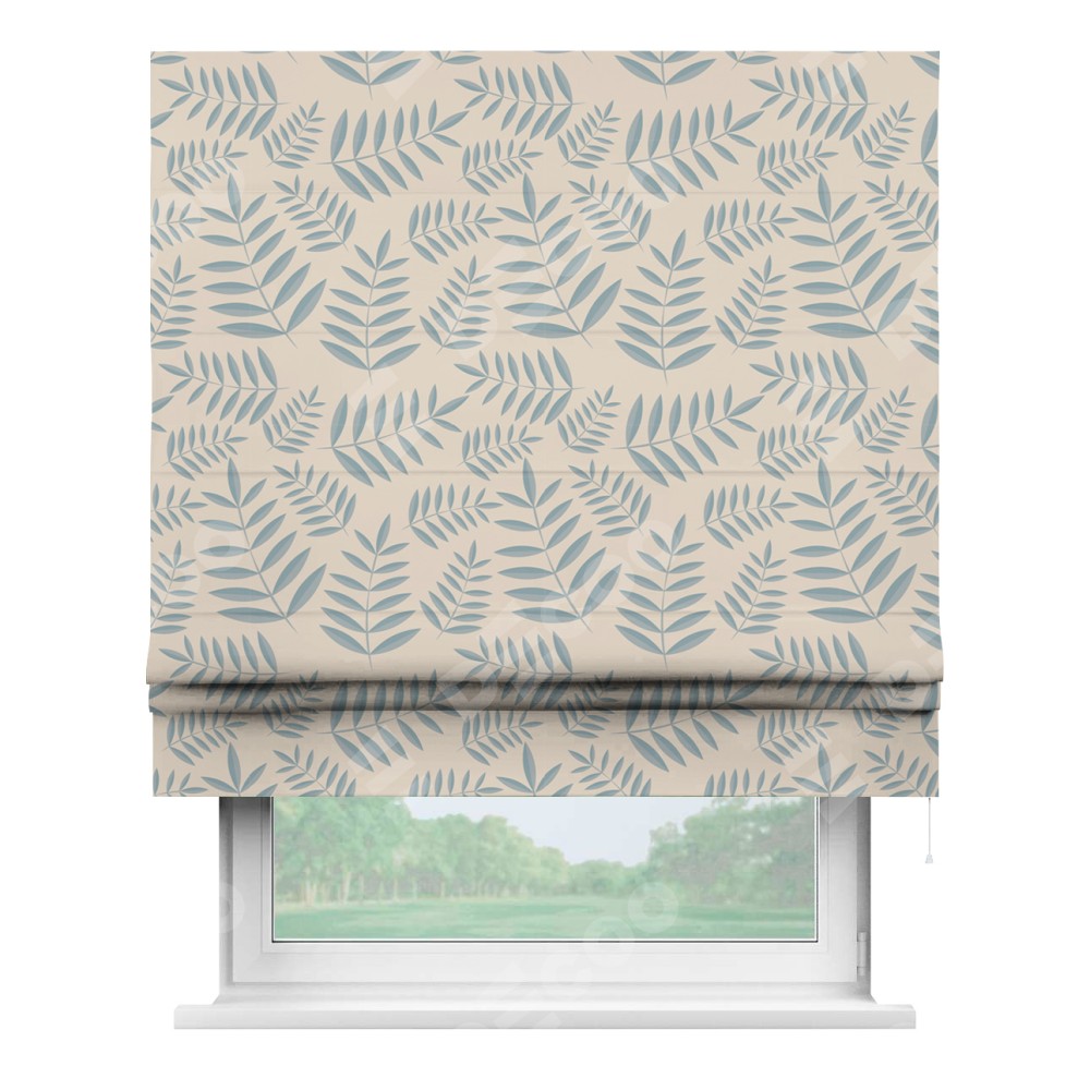 Римская штора производителя «Cortin», используется для проёма, пошита из ткани блэкаут с нанесением сублимационной печати «Веточка с листочками». Имеет универсальный механизм и подходит для монтажа: на потолок, на стену и в нишу.