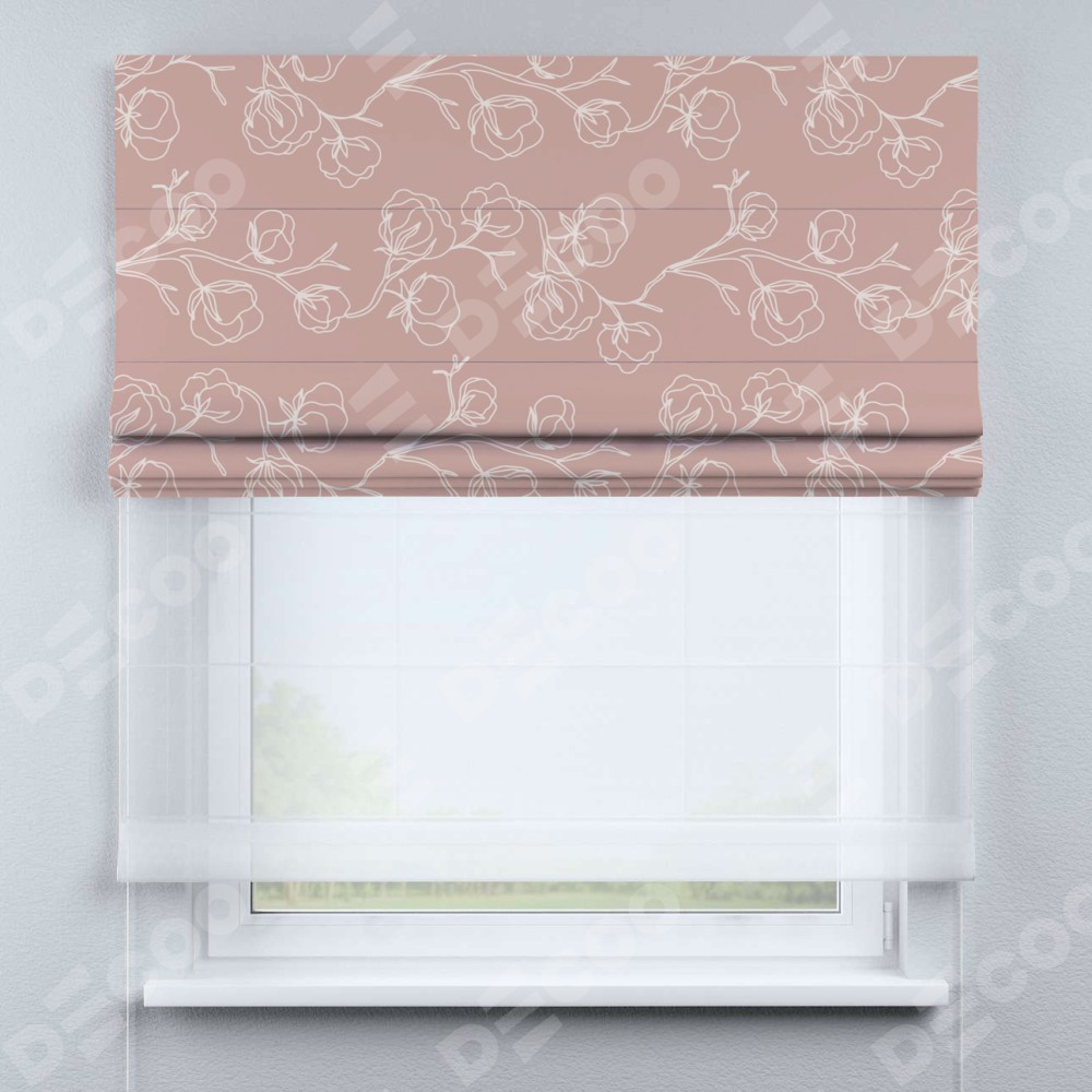 Римская штора день-ночь производителя «Cortin», используется для проёма, пошита из двух полотен, с лицевой блэкаут с нанесением сублимационной печати «Нежные цветы», вторая ткань тюль (по стандарту комплектуется тюль белого цвета артикул V-01). Имеет универсальный механизм и подходит для монтажа: на потолок, на стену и в нишу.