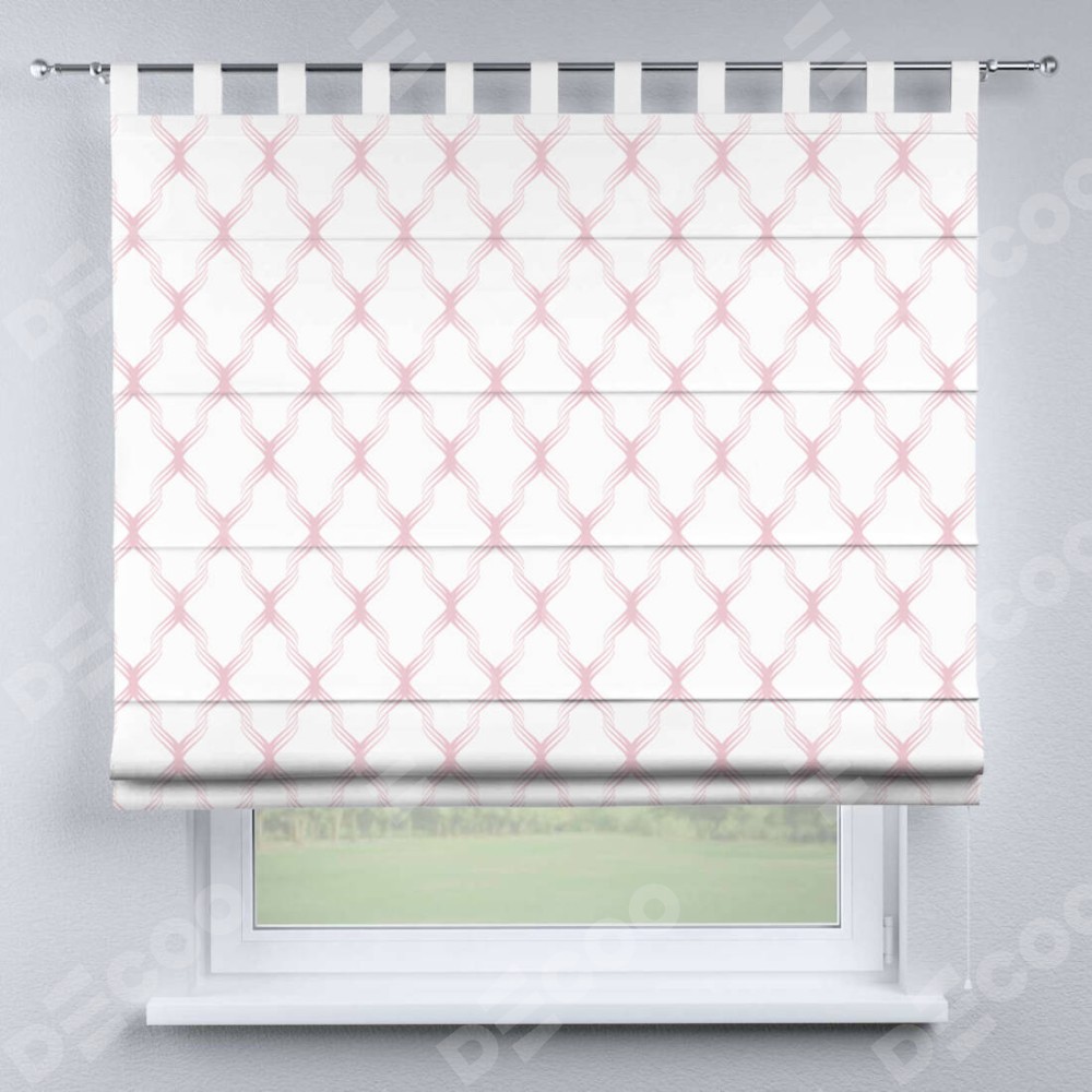 Римская штора производителя «Cortin», используется для проёма, пошита из ткани блэкаут с нанесением сублимационной печати «Розовые ромбы». Данная модель пошита на петлях, комплектуется на выбор круглым карнизом и подходит для монтажа на стену. Римская штора на петлях имеет простую систему регулировки высоты, отличительным преимуществом данной модели является простой способ монтажа. Достаточно повесить ее на трубу и штора готова!