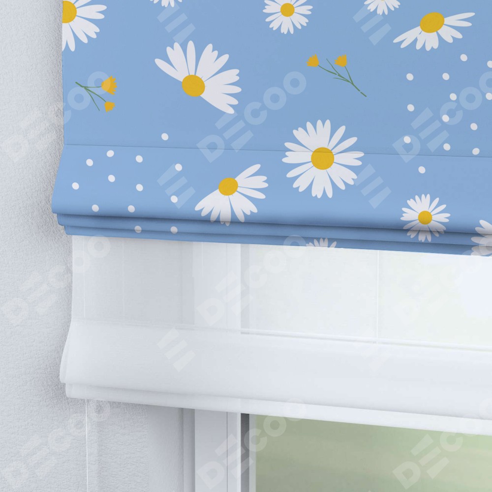 Римская штора день-ночь производителя «Cortin», используется для проёма, пошита из двух полотен, с лицевой блэкаут с нанесением сублимационной печати «Ромашки на голубом», вторая ткань тюль (по стандарту комплектуется тюль белого цвета артикул V-01). Имеет универсальный механизм и подходит для монтажа: на потолок, на стену и в нишу.