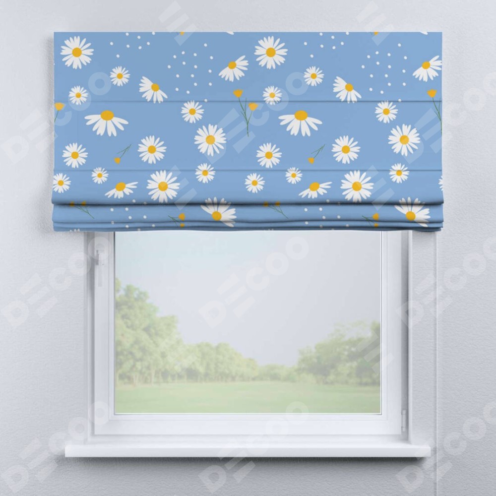 Римская штора производителя «Cortin», используется для проёма, пошита из ткани блэкаут с нанесением сублимационной печати «Ромашки на голубом». Имеет универсальный механизм и подходит для монтажа: на потолок, на стену и в нишу.