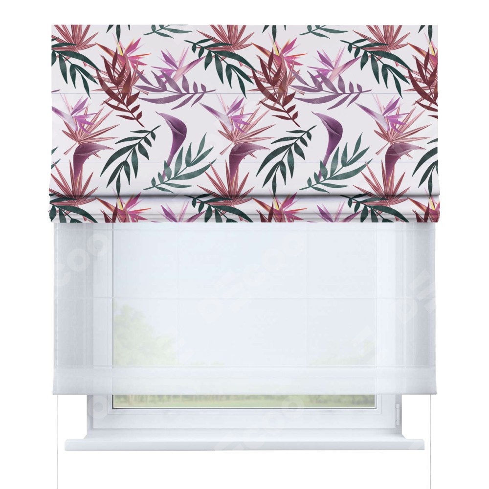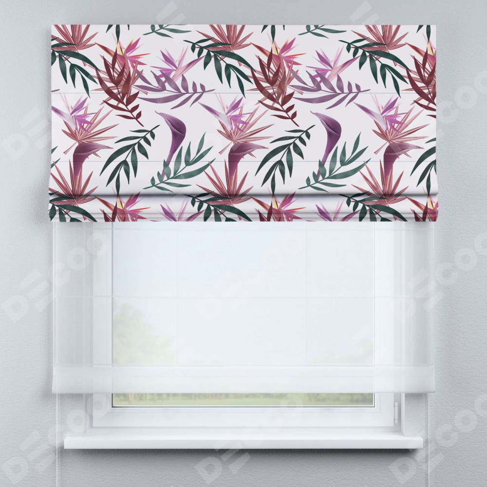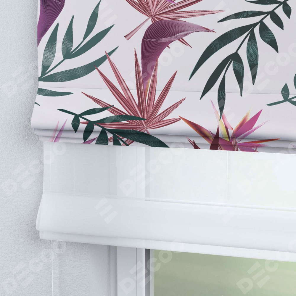 Римская штора день-ночь производителя «Cortin», используется для проёма, пошита из двух полотен, с лицевой блэкаут с нанесением сублимационной печати «Тропические побеги», вторая ткань тюль (по стандарту комплектуется тюль белого цвета артикул V-01). Имеет универсальный механизм и подходит для монтажа: на потолок, на стену и в нишу.