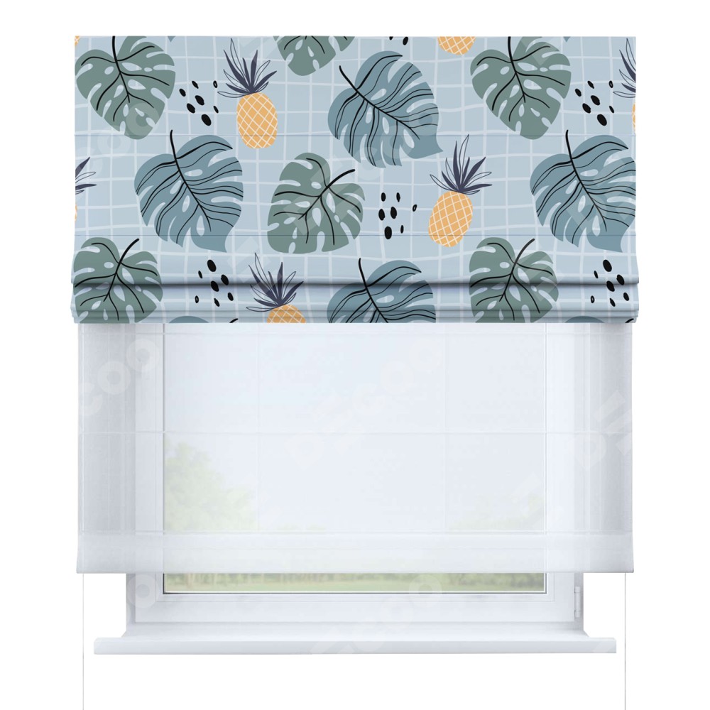 Римская штора день-ночь производителя «Cortin», используется для проёма, пошита из двух полотен, с лицевой блэкаут с нанесением сублимационной печати «Ананасы и листья монстеры», вторая ткань тюль (по стандарту комплектуется тюль белого цвета артикул V-01). Имеет универсальный механизм и подходит для монтажа: на потолок, на стену и в нишу.