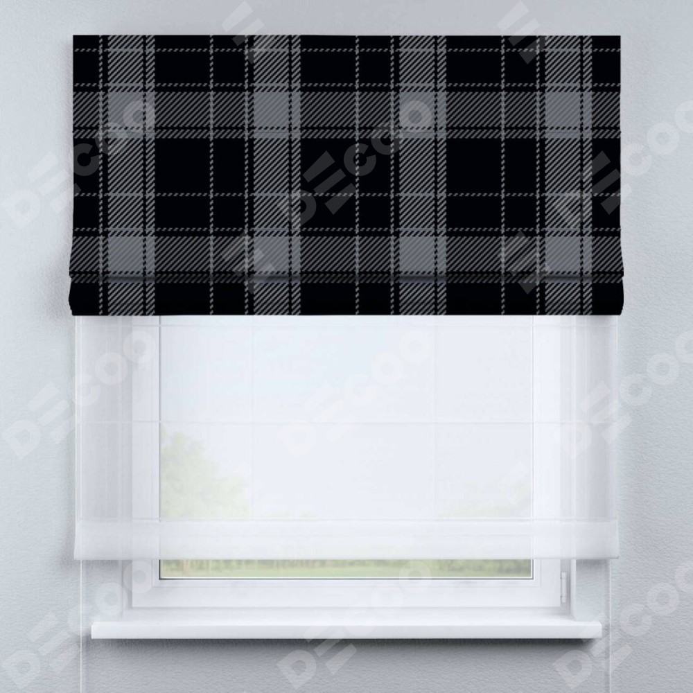 Римская штора день-ночь производителя «Cortin», используется для проёма, пошита из двух полотен, с лицевой блэкаут с нанесением сублимационной печати «Стильная клетка», вторая ткань тюль (по стандарту комплектуется тюль белого цвета артикул V-01). Имеет универсальный механизм и подходит для монтажа: на потолок, на стену и в нишу.