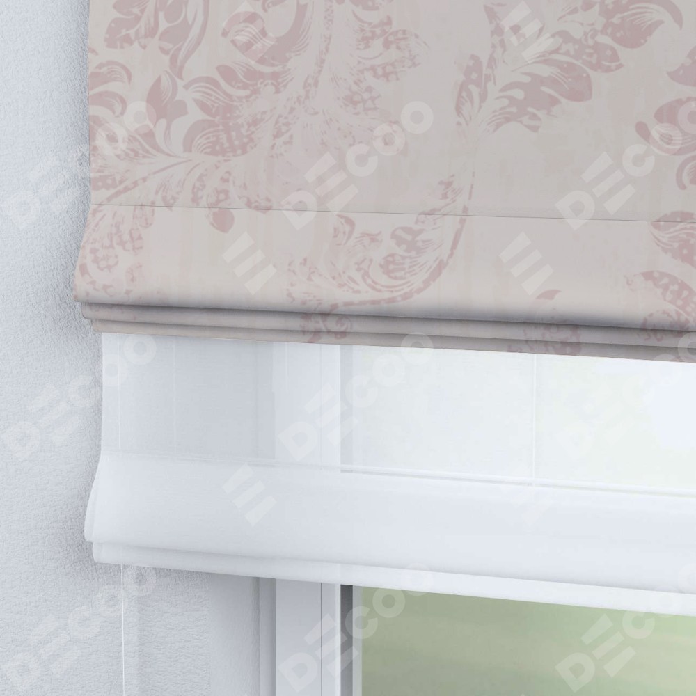 Римская штора день-ночь производителя «Cortin», используется для проёма, пошита из двух полотен, с лицевой блэкаут с нанесением сублимационной печати «Винтажный узор пудровый», вторая ткань тюль (по стандарту комплектуется тюль белого цвета артикул V-01). Имеет универсальный механизм и подходит для монтажа: на потолок, на стену и в нишу.