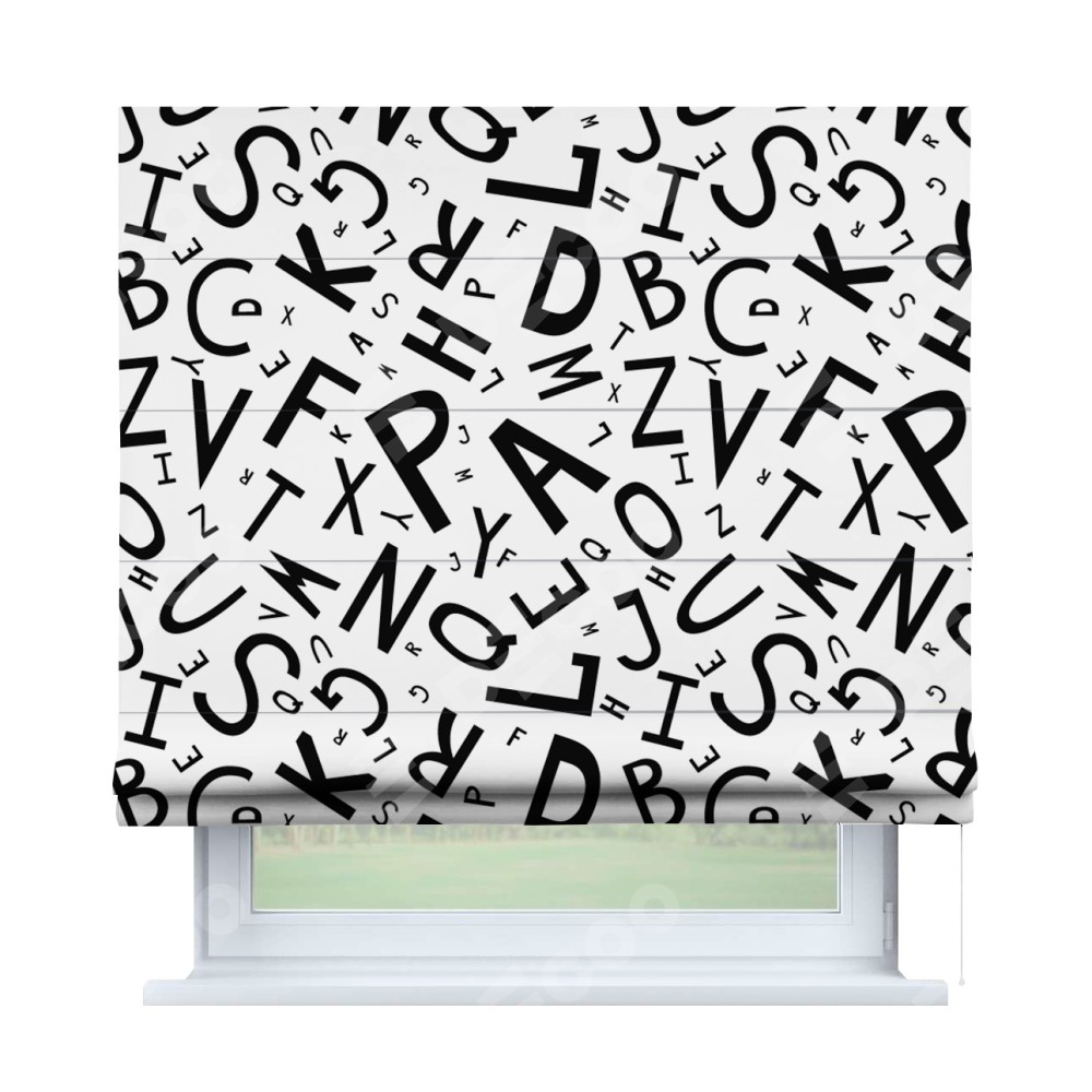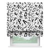 Римская штора производителя «Cortin», используется для проёма, пошита из ткани блэкаут с нанесением сублимационной печати «Литеры на белом». Имеет универсальный механизм и подходит для монтажа: на потолок, на стену и в нишу.