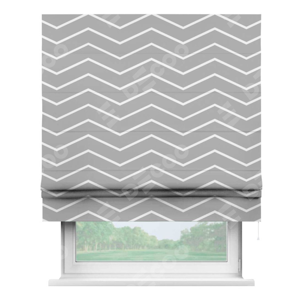 Римская штора производителя «Cortin», используется для проёма, пошита из ткани блэкаут с нанесением сублимационной печати «Серый зигзаг». Имеет универсальный механизм и подходит для монтажа: на потолок, на стену и в нишу.