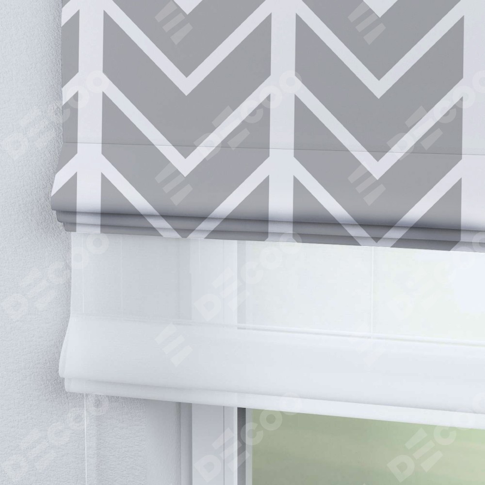 Римская штора день-ночь производителя «Cortin», используется для проёма, пошита из двух полотен, с лицевой блэкаут с нанесением сублимационной печати «Современная геометрия», вторая ткань тюль (по стандарту комплектуется тюль белого цвета артикул V-01). Имеет универсальный механизм и подходит для монтажа: на потолок, на стену и в нишу.