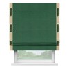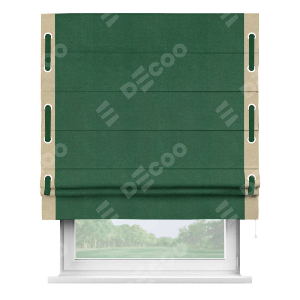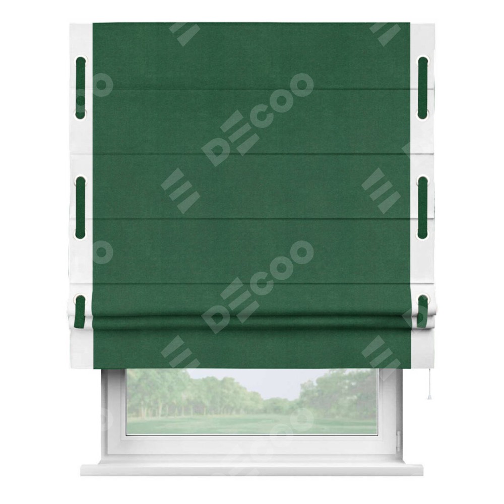 Римская штора производителя «Cortin», используется для проёма, пошита из ткани вельвет зеленый, артикул ткани 85546. Отделка шторы кантом «Стрим Дуо» на кантах расположены люверсы с пояском, ткань для канта используется из вельвета разной расцветки на выбор. Ткань для пояска обычно используется из основной ткани шторы, а так же можно сделать из любой расцветки по желанию. Имеет универсальный механизм и подходит для монтажа: на потолок, на стену и в нишу.