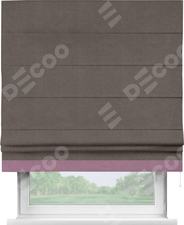 Римская штора производителя «Cortin», используется для проёма, пошита из ткани вельвет коричневый, артикул ткани 14135. Отделка шторы кантом «Джестер», ткань для канта используется из вельвета разной расцветки на выбор. Имеет универсальный механизм и подходит для монтажа: на потолок, на стену и в нишу.