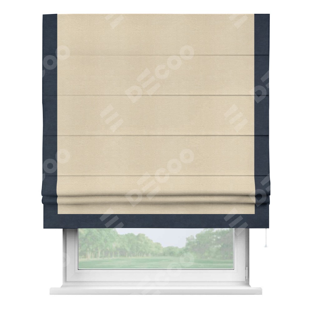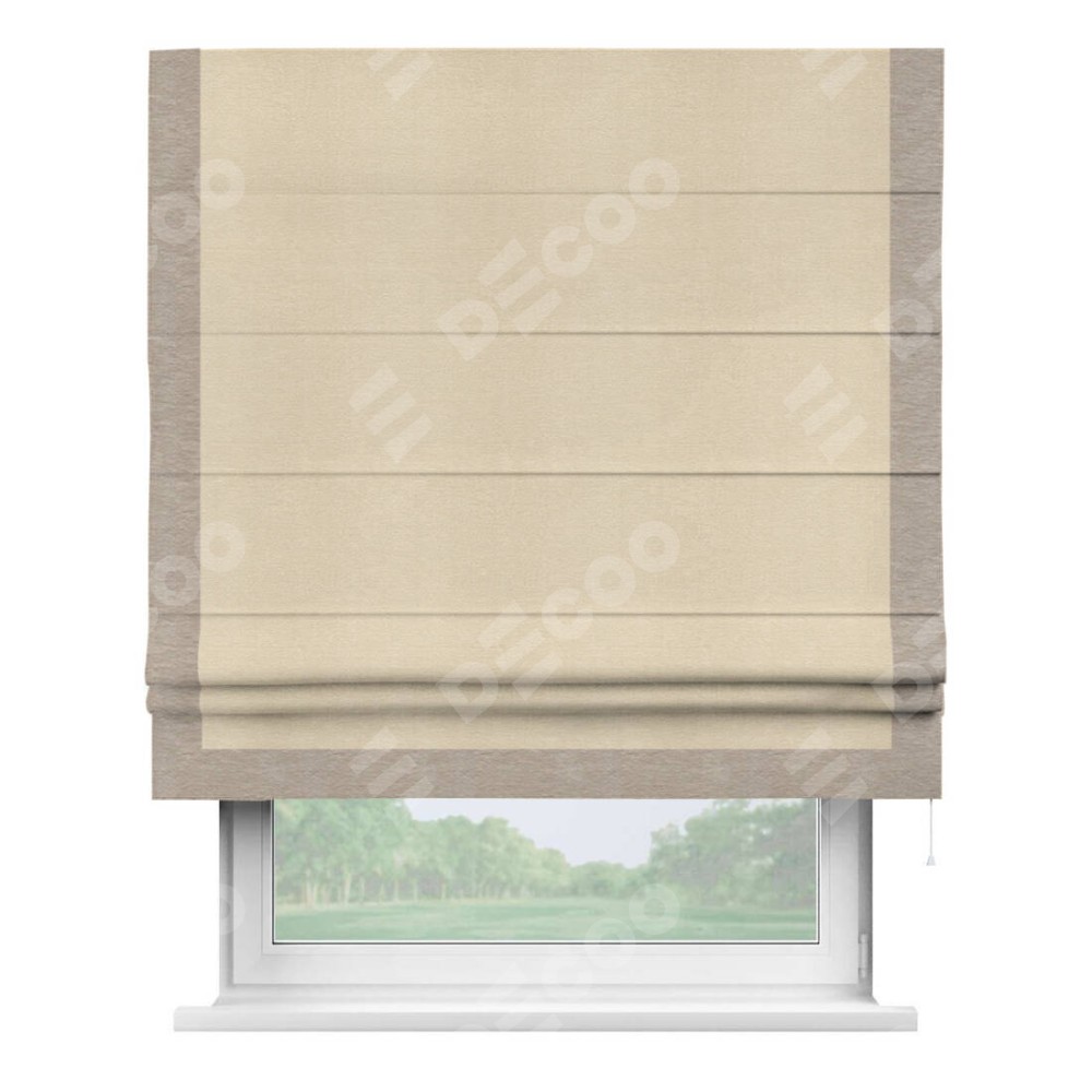 Римская штора производителя «Cortin», используется для проёма, пошита из ткани софт однотонный бежевый лайт, артикул 33100. Отделка шторы кантом «Виктория», ткань для канта используется из софта разной расцветки на выбор. Имеет универсальный механизм и подходит для монтажа: на потолок, на стену и в нишу.