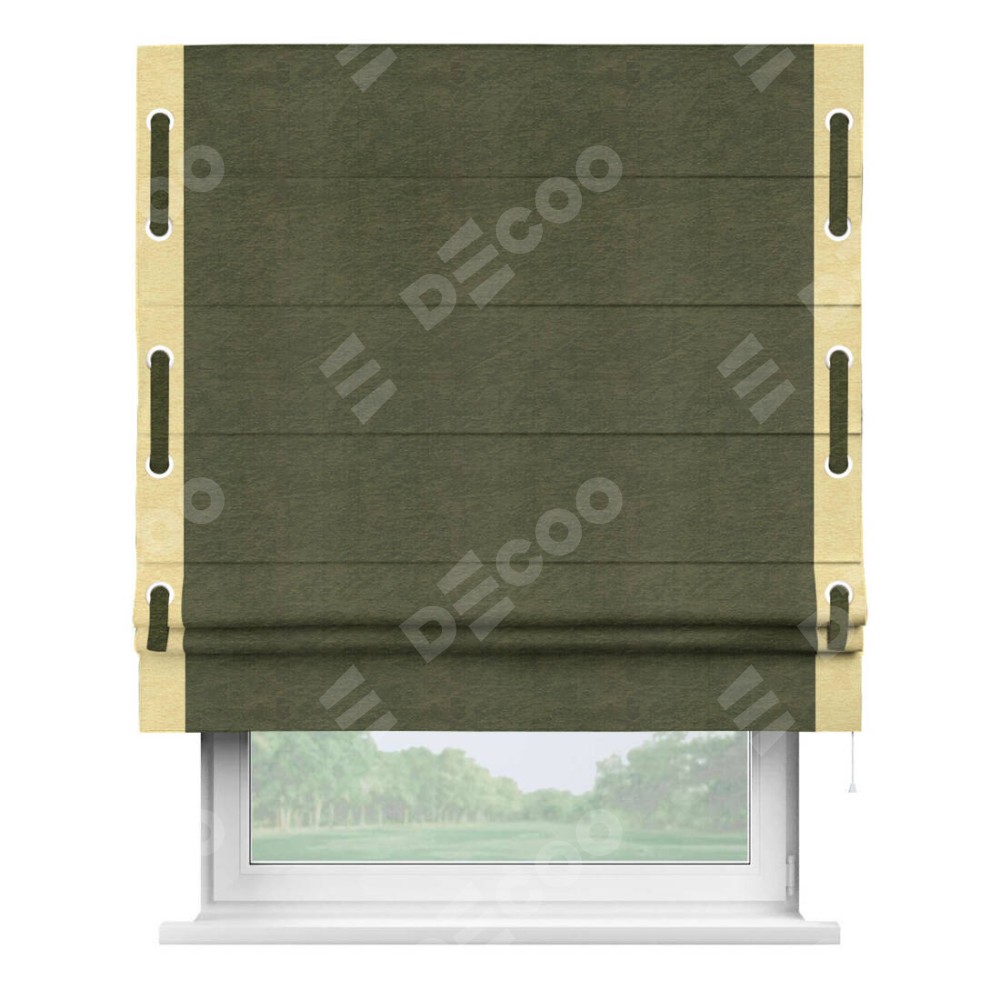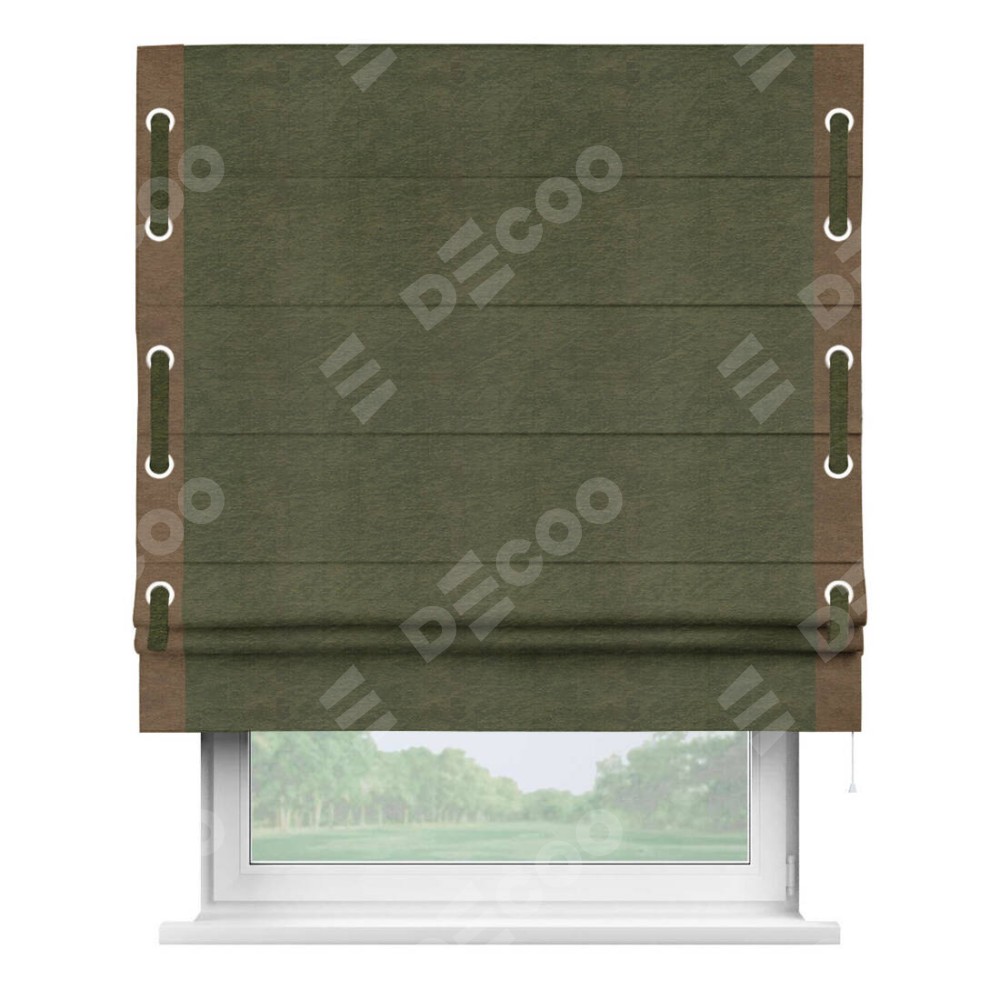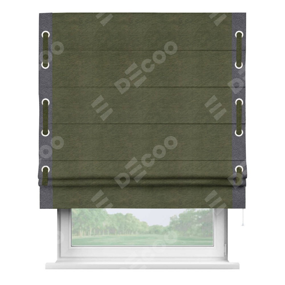 Римская штора производителя «Cortin», используется для проёма, пошита из ткани софт однотонный зелёный, артикул 33110. Отделка шторы кантом «Стрим Дуо» на кантах расположены люверсы с пояском, ткань для канта используется из софта разной расцветки на выбор. Ткань для пояска обычно используется из основной ткани шторы, а так же можно сделать из любой расцветки по желанию. Имеет универсальный механизм и подходит для монтажа: на потолок, на стену и в нишу.