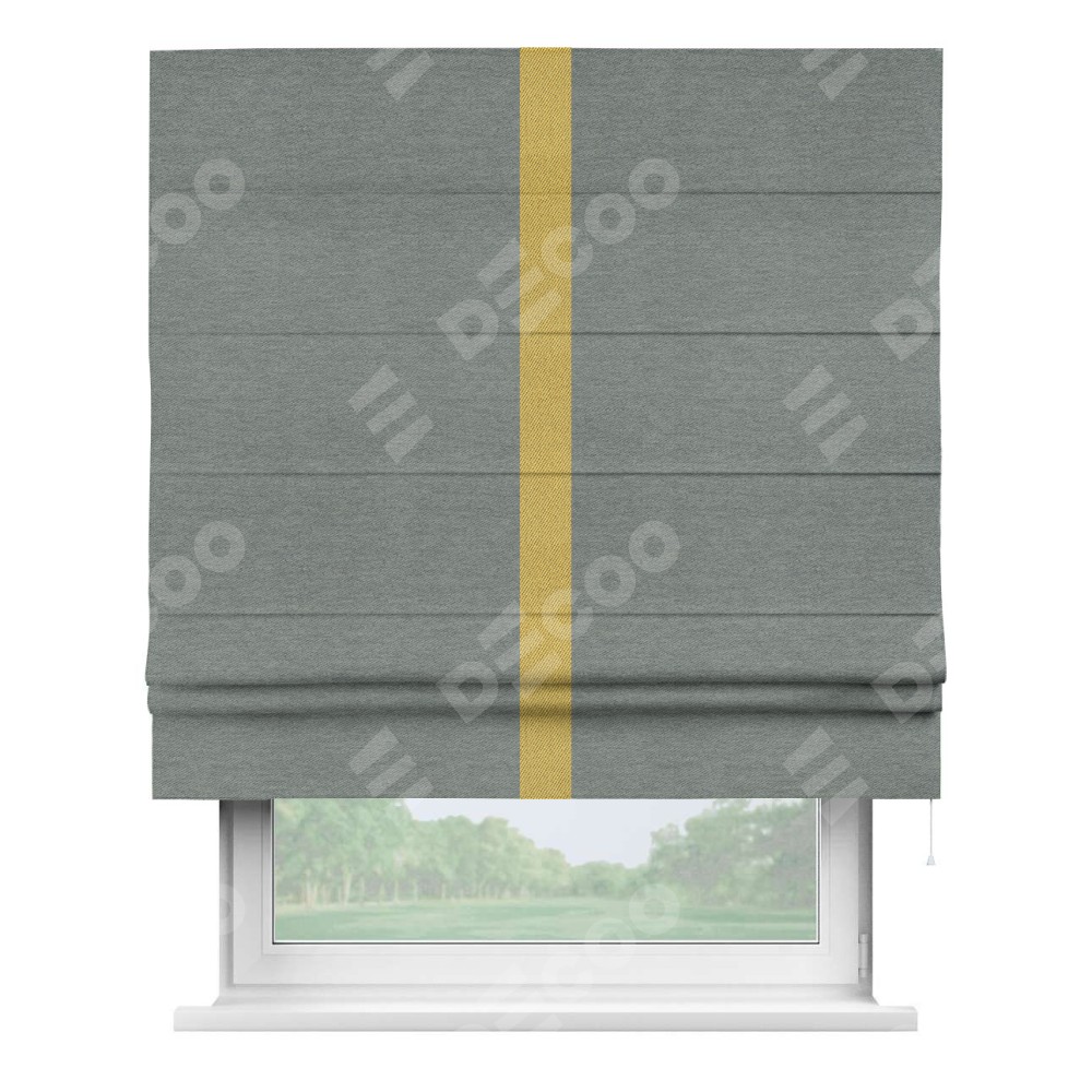 Римская штора производителя «Cortin», используется для проёма, пошита из ткани твид блэкаут серый, артикул 21577. Отделка шторы кантом «Хайвэй», ткань для канта используется из твида разной расцветки на выбор. Имеет универсальный механизм и подходит для монтажа: на потолок, на стену и в нишу.
