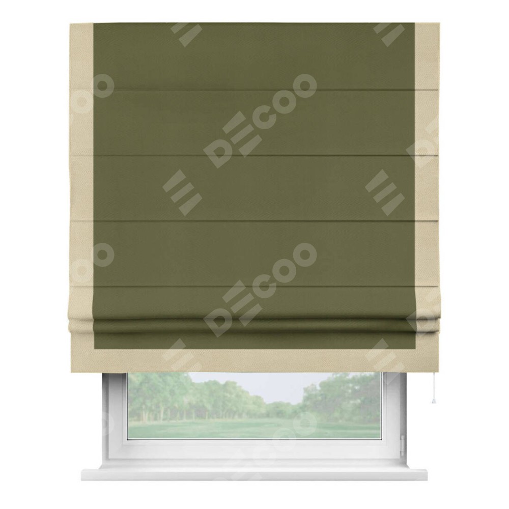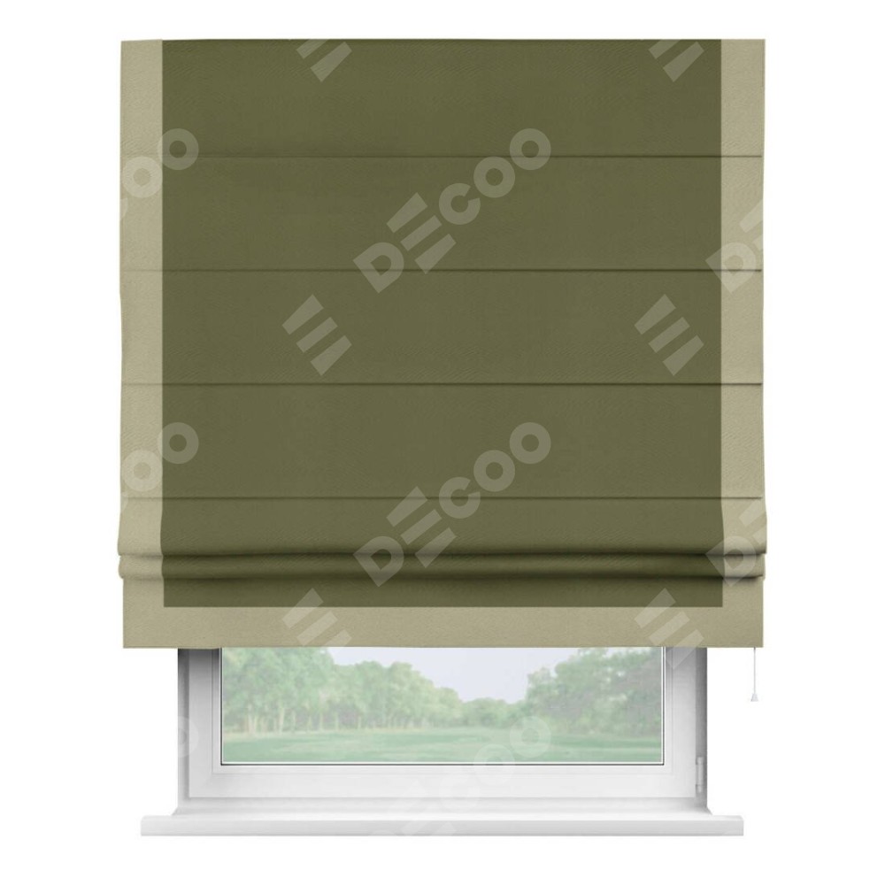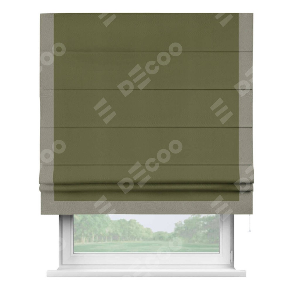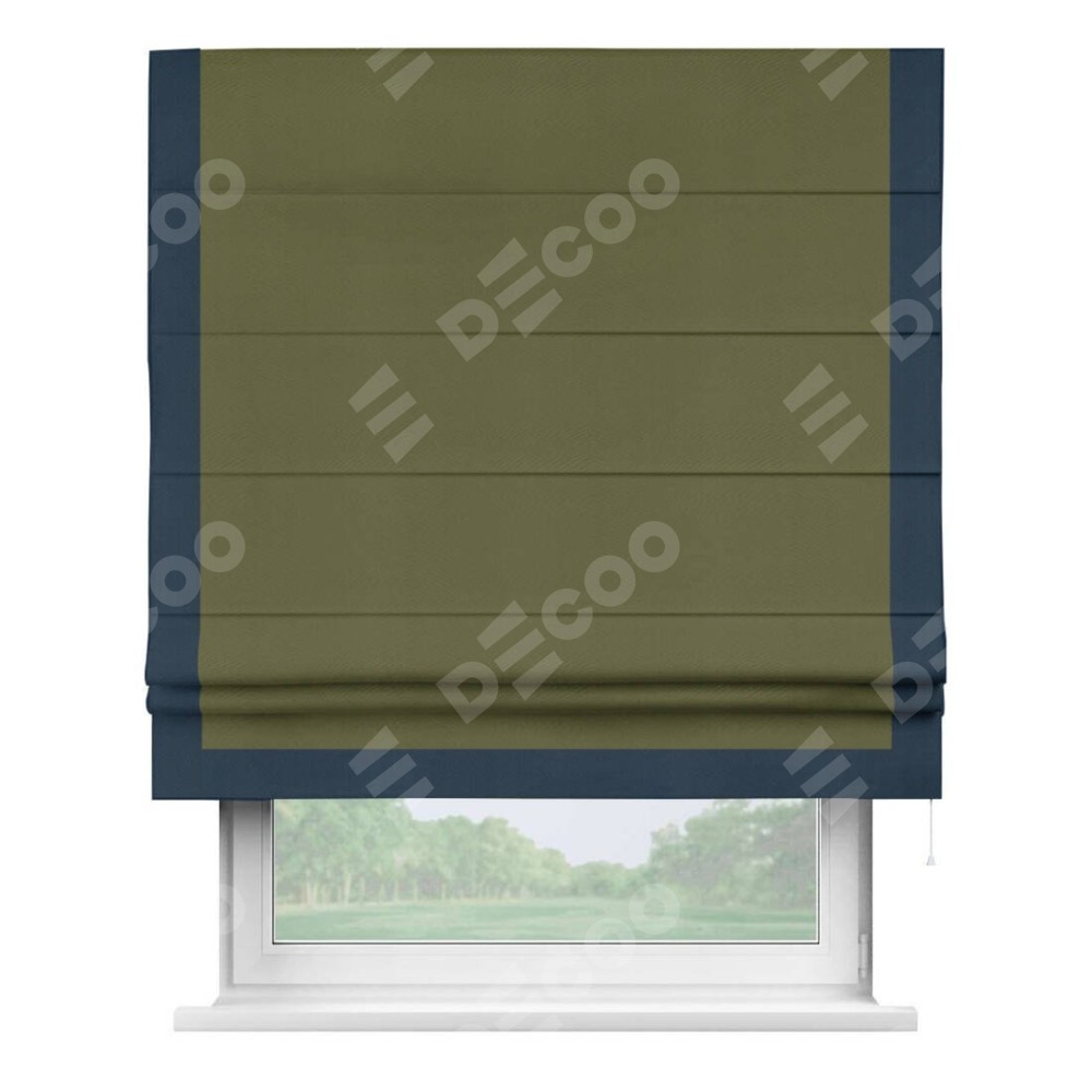 Римская штора производителя «Cortin», используется для проёма, пошита из ткани блэкаут однотонный зелёный, артикул ткани 81859. Отделка шторы кантом «Виктория», ткань для канта используется из блэкаута однотонного разной расцветки на выбор. Имеет универсальный механизм и подходит для монтажа: на потолок, на стену и в нишу.